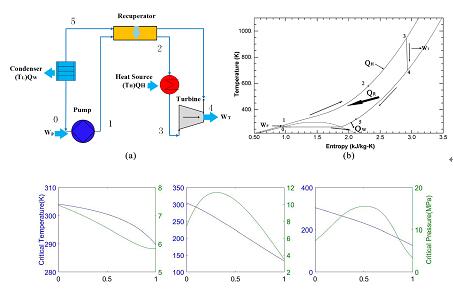 針對跨臨界循環選擇適當的比例,合適種類的工質,是否可提高其循環熱效率,只是現在還沒有定論。本次報告主要探究降低臨界點,相同程度時,不同混合工質的種類對于循環效率的影響是否有差異。