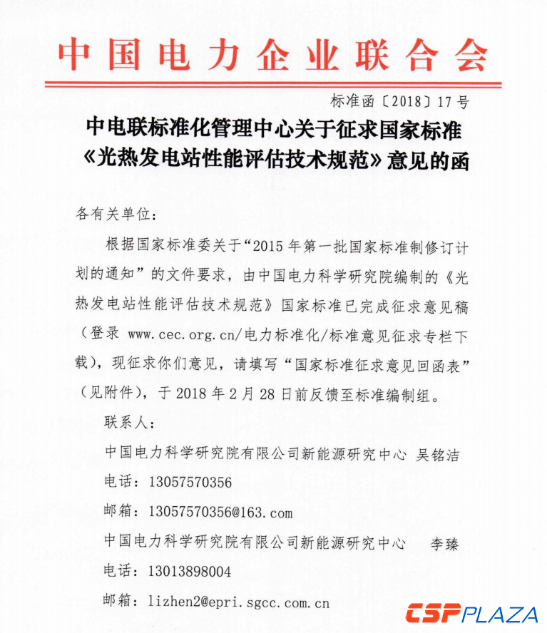 CSPPLAZA光熱發電網訊:近日,中電聯標準化管理中心發布了國家標準《光熱發電站性能評估技術規范》(以下簡稱《規范》)征求意見稿,面向各單位征求意見,要求于2018年2月28日前,將“國家標準征求意見回函表”反饋至標準編制組。
