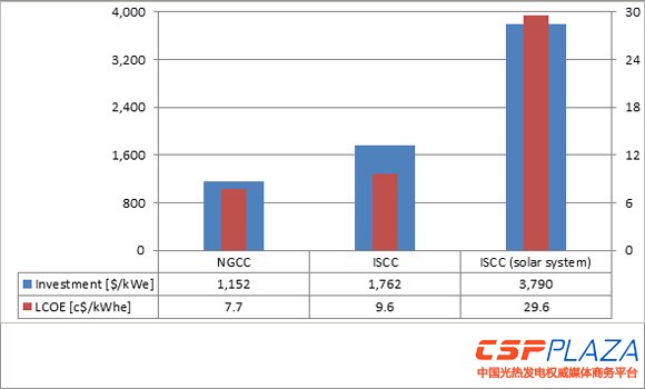 圖表2則顯示了ISCC電站和相對應的NGCC電站的投資成本對比情況,NGCC電站的投資成本為1152美元/kw,LCOE為7.7美分/kwh,對應的ISCC電站的投資成本為1762美元/kw,LCOE為9.6美分/kwh,其中ISCC電站中的光熱發電部分的投資成本為3790美元/kw,LCOE為29.6美分/kwh。從這一組數據可以看出,ISCC項目的投資成本要高出NGCC電站,約是NGCC電站的152.95%。但相對光熱發電的3790美元/kw,其投資成本僅為光熱發電的46.49%。而在LCOE方面,ISCC電站的LCOE是NGCC電站的124.68%,但相對光熱發電的29.6美分/kwh,僅是其的32.43%。這意味著相對純粹的光熱電站來看,ISCC混合電站是更具經濟性的發電方式。
