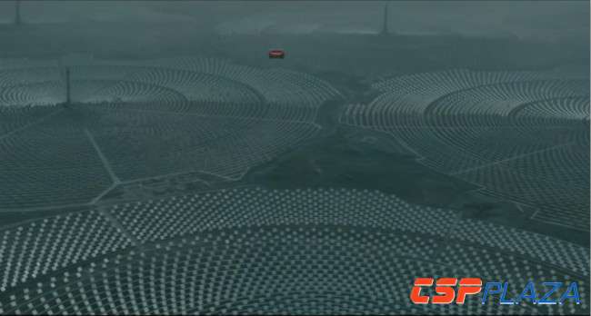 其實這個場景是基于實景拍攝,其外景地正是西班牙的Gemasolar光熱電站。電影里的每一個電站由140米高中央集熱塔,2600面定日鏡組成,每塊120平方米,整個采光區占地480英畝。后期特效又復制、合成了數個同樣大小的鏡面陣列和中央集熱塔,集群的視覺效果,更具震撼力。