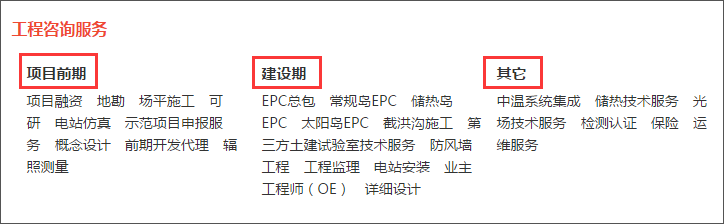 工程咨詢服務部分包含范圍則更廣,涉及到光熱電站開發的方方面面。該類目主要分為項目前期、建設期和其它三部分,包含了EPC總包、可研、詳細設計、業主工程師、系統集成、運維服務等關鍵角色,詳見下圖:
