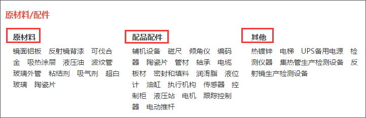最后是原材料/配件,顧名思義,該部分主要涉及到組成光熱發電設備的配件供應商,以及光熱電站開發或運行要用到的一些原材料。該類目分為原材料、配品配件和其他三部分,也涉及到更多目前尚未關注到光熱發電行業的供應商,詳見下圖: