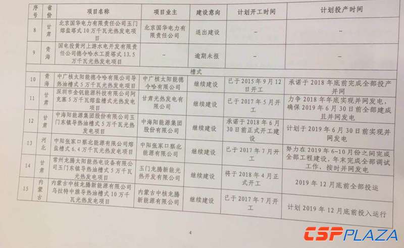 3、通報中所列承諾繼續建設的示范項目投資企業,須按照通報中明確的計劃開工時間和計劃投產時間,同時落實安全生產責任和工程質量要求,確保示范項目建成投產。對于未按通報明確時限開工或投運的項目投資企業,將視情節輕重予以通報或限制參與后續太陽能熱發電示范項目建設。(這意味著,此前各示范項目業主方向政府承諾的計劃開工時間和計劃投產時間,將與懲罰機制相掛鉤。各示范項目的承諾情況請見附表。)