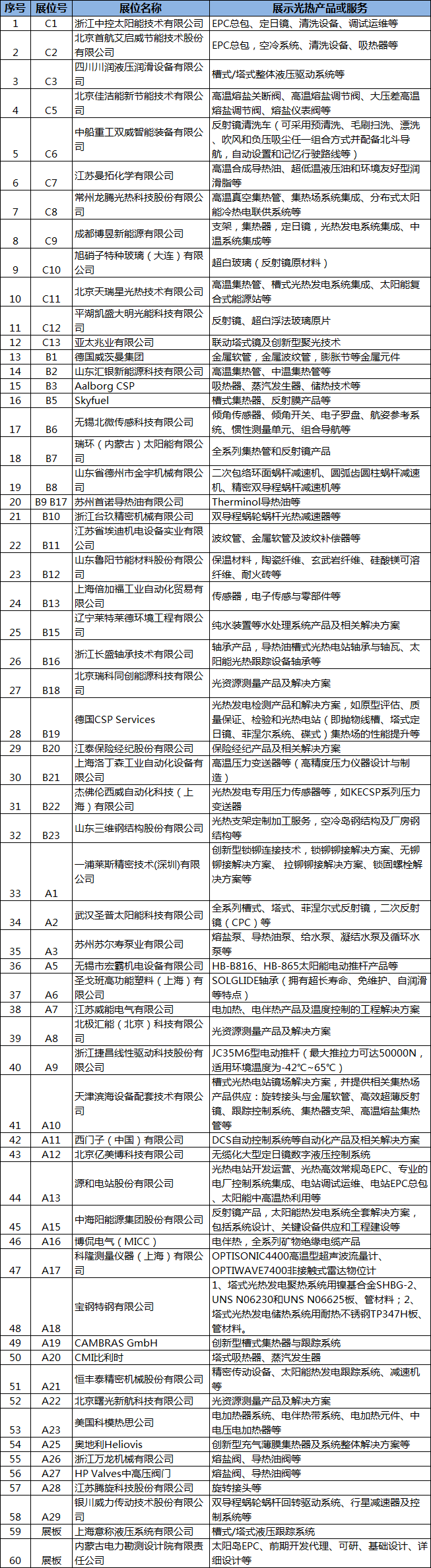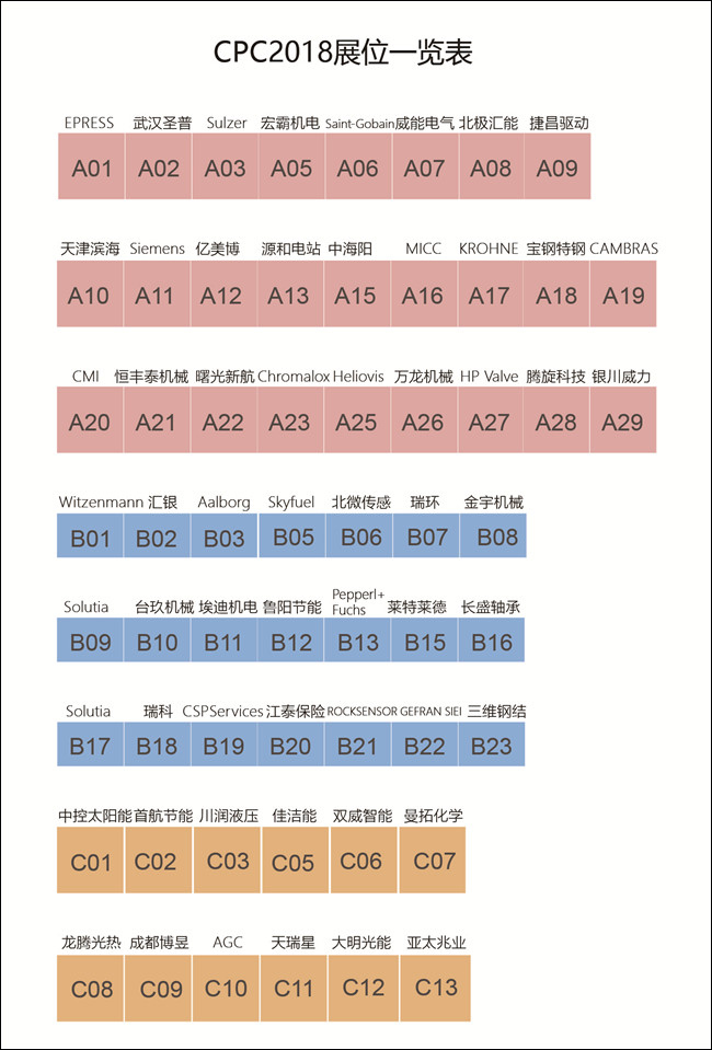 截至目前,所有展臺均已確定合作方(僅余少量大型展板可以合作),共有60家來自全球光熱發電行業的優秀產品供應商和技術服務商已確定將在CPC2018大會中進行展示。參展產品覆蓋了反射鏡、超白玻璃、集熱管、定日鏡、集熱器、液壓跟蹤系統、清洗車、吸熱器、蒸汽發生器、熔鹽泵、導熱油泵、電加熱、電伴熱、不銹鋼材料(板材、管材)、波紋管、金屬軟管、旋轉接頭、膨脹節、保溫材料、支架、軸承、回轉減速機、電動推桿、傳感器、閥門、流量計、導熱油、純水裝置、水處理系統、輻射測量系統等全產業鏈相關產品,此外還有多家知名EPC總包商、檢測服務機構、新型集熱技術提供商、儲能解決方案供應商、中溫系統集成商、保險經紀服務商也將攜技術解決方案參與此次展會。