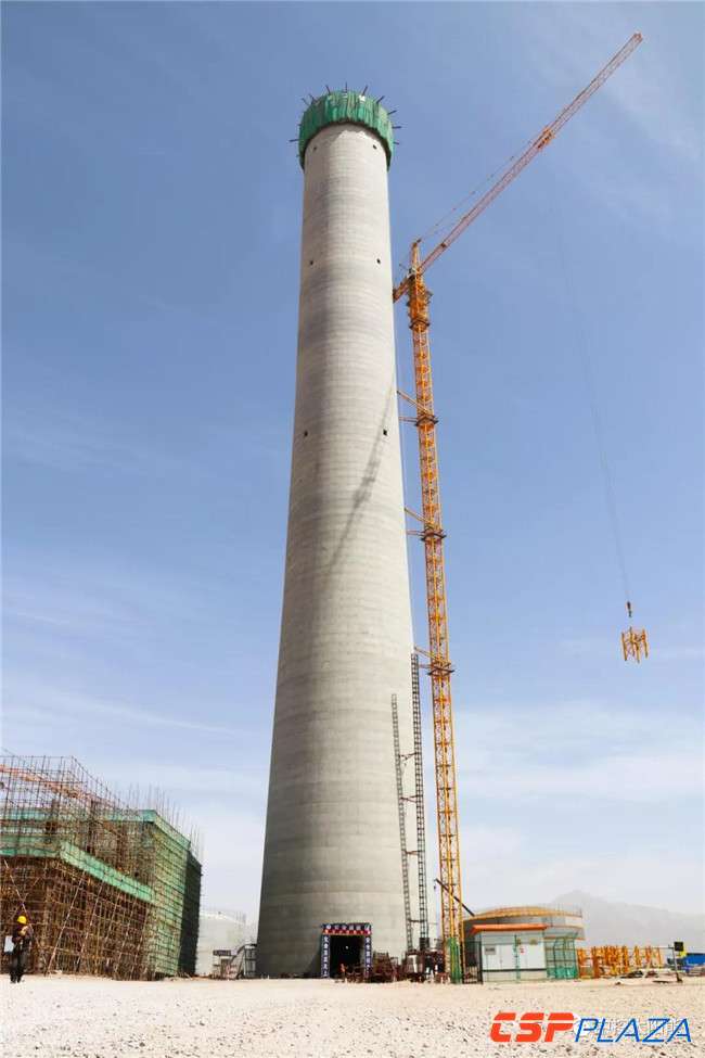 該項目吸熱器中心高度200米,吸熱塔混凝土筒身高度183.2米。吸熱塔于2017年7月5日基礎開挖,2017年11月17日至2018年3月5日期間因天氣寒冷而停止施工,經過累計216天的施工,最終于2018年5月25日順利結頂,后續將進入鋼結構和設備安裝階段。