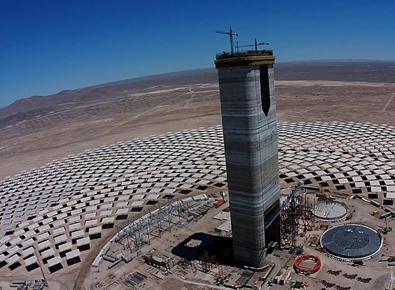 該項目于2014年7月在智利北部Antofagasta地區開工建設。其中的塔式電站是拉丁美洲首個光熱發電項目,占地面積超過700公頃。其采用熔鹽傳熱儲熱技術,儲熱時長達17.5小時,可實現全天24小時持不間斷發電,并配置10,600面140㎡大小的定日鏡。