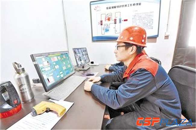 圖:崇(chong)陽小區熔鹽儲能綠(lv)色供(gong)熱(re)站內,維護人員正在(zai)控(kong)制(zhi)室內對設備運行進行遠程監控(kong)