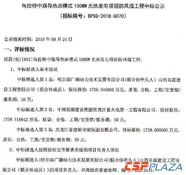 CSPPLAZA光熱發電網訊:內蒙古烏拉特中旗槽式100MW光熱發電項目防風墻工程中標公示今日發布,公示結束時間為8月24日。哈爾濱廣瀚動力技術發展有限公司和山西名流建設工程有限公司聯合體為第一中標候選人,投標報價為1726萬元,工期/交貨期/服務期為50天。