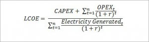 LCOE可通過下述公式計算得到,這個公式告訴了我們LCOE的影響因子。其中:n=項目壽命期;r=貼現率;CAPEX=總的項目初始投資;OPEX=運維總支出;Electricity Generated=發電量。