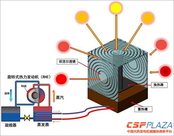 立方體內部配置有鋁合金制造的用于接收菲涅爾透鏡所聚集的光的倒T字型換熱器,無論太陽光是從側面還是從上面照射,均可高效提取熱能。換熱器下方是裝滿水的蓄熱槽,在此生成的溫水將供應給Da Vinci公司開發的“旋轉式熱力發動機”進行發電。旋轉式熱力發動機通過將作為熱介質的氟利昂替代物轉換為氣體來驅動發動機運轉。該發動機是利用氣缸容積的變化生成旋轉能,因此即使在低溫熱源生成的低壓力下,熱工作效率也十分出色。具體來說,即使40℃左右的溫度也可驅動。