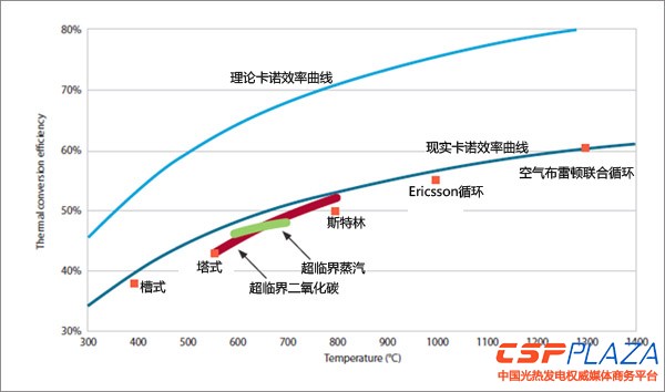 根據卡諾循環原理,卡諾循環中的熱機效率的計算公式如下:卡諾效率η=1-Tc/Th(Tc指低溫熱源溫度,Th指高溫熱源溫度),熱量循環的溫差越高,發電效率越高。當前光熱電站的實際運行效率還遠低于卡諾循環的理論效率。
