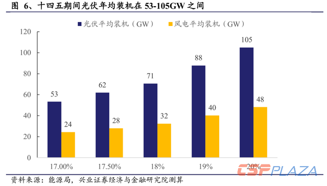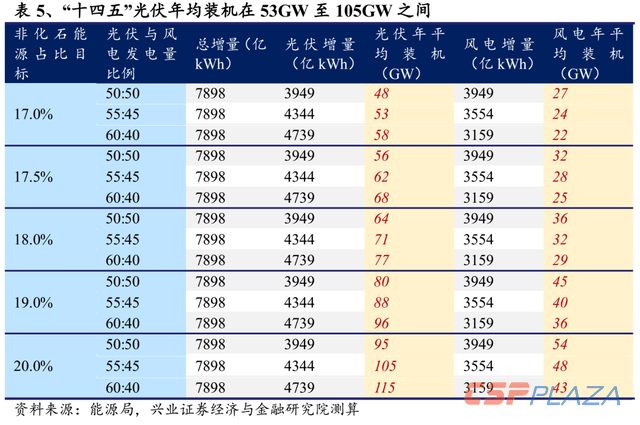進一(yi)步(bu)對光伏與(yu)風(feng)電在(zai)十(shi)四(si)五期(qi)間的(de)發電量(liang)比例(li)進行多(duo)場景測算,在(zai)2025年(nian)(nian)光伏與(yu)風(feng)電的(de)發電量(liang)比例(li)為55:45的(de)假設下,光伏年(nian)(nian)平均裝(zhuang)機(ji)需求(qiu)53-105GW,風(feng)電年(nian)(nian)平均裝(zhuang)機(ji)需求(qiu)24-48GW。