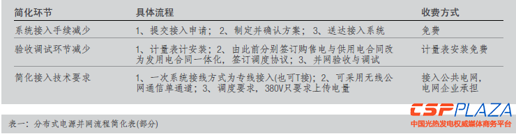 2013年2月27日,中國國家電網公司召開加強分布式電源并網服務電視電話會議暨新聞發布會,發布了《關于做好分布式電源并網服務工作的意見》、《關于促進分布式電源并網管理工作的意見》、《分布式電源接入配電網相關技術規范》三個文件,其中適用于分布式光伏發電,與居民息息相關的一些工作細項做了進一步簡化與明確規定,詳見表一。