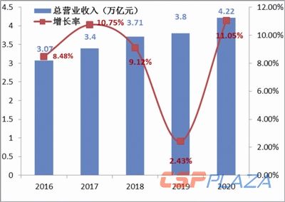 圖9 2016-2020年“500強(qiang)”中國企業(ye)總(zong)營業(ye)收(shou)入及增長(chang)率(lv)情況