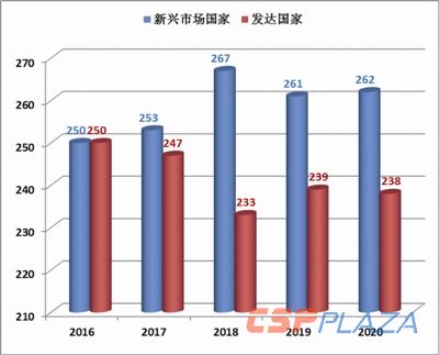 圖4 2016-2020年“500強”企(qi)業(ye)中新興市場國家與發達國家企(qi)業(ye)數