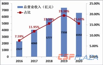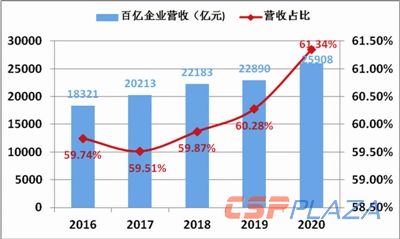 圖15 2016-2020年“500強”百(bai)億企業(ye)營業(ye)收入及占(zhan)比情(qing)況