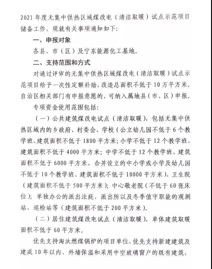 近日(ri),寧夏(xia)回族自治區財政廳(ting)、生態環境廳(ting)、發改委(wei)聯合(he)下發《關于開展2021年無集中供熱區域煤改電(清潔取暖(nuan))試點示(shi)范項目儲(chu)備工作的通(tong)知(zhi)》。