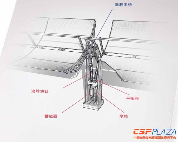 該機械機構,由追蹤油缸、平衡閥、蓄能器、泵站(一般由電機和4個液壓閥組成)等構成。控制系統控制兩個油缸來驅動定日鏡旋轉到追蹤的位置。該裝置被成功的應用于國外的槽式電站中。一般都是南北向來進行安裝。