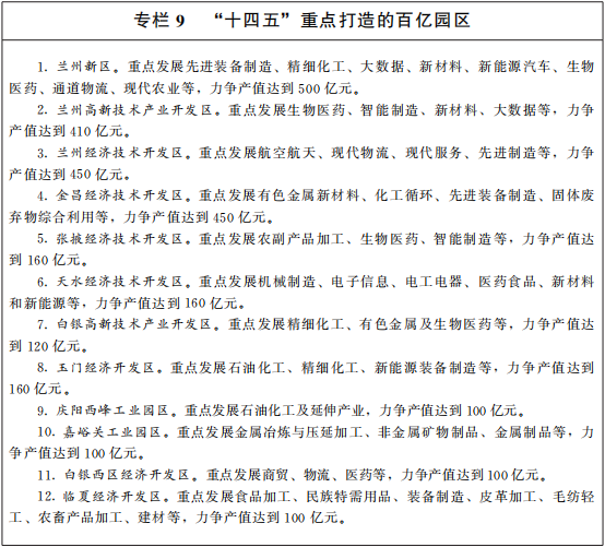 打(da)造(zao)百(bai)(bai)億園(yuan)(yuan)(yuan)(yuan)區(qu)(qu)(qu)(qu)。依托各級開(kai)發(fa)(fa)區(qu)(qu)(qu)(qu)等(deng)(deng)重(zhong)大平臺和載體,全面提升(sheng)園(yuan)(yuan)(yuan)(yuan)區(qu)(qu)(qu)(qu)基礎設施和服務能力(li),積極(ji)承(cheng)接(jie)產(chan)業(ye)轉移(yi),吸納“飛地經濟”。抓住承(cheng)接(jie)產(chan)業(ye)轉移(yi)重(zhong)要(yao)(yao)窗口期,建立承(cheng)接(jie)產(chan)業(ye)轉移(yi)協(xie)調落實機制,完善信息對接(jie)、權(quan)益分(fen)享、稅收分(fen)成體系,千方百(bai)(bai)計承(cheng)接(jie)符合產(chan)業(ye)政(zheng)策(ce)、環保政(zheng)策(ce)、適合我省(sheng)發(fa)(fa)展的產(chan)業(ye)。充分(fen)發(fa)(fa)揮要(yao)(yao)素成本、資源(yuan)和通道等(deng)(deng)優(you)勢,集中優(you)質要(yao)(yao)素向園(yuan)(yuan)(yuan)(yuan)區(qu)(qu)(qu)(qu)配置(zhi),引導(dao)產(chan)業(ye)項(xiang)目在園(yuan)(yuan)(yuan)(yuan)區(qu)(qu)(qu)(qu)落地。加強銜接(jie)對接(jie)、定(ding)點招(zhao)商、精準招(zhao)商,落地一批大項(xiang)目好(hao)項(xiang)目,推(tui)動產(chan)業(ye)園(yuan)(yuan)(yuan)(yuan)區(qu)(qu)(qu)(qu)化(hua)、園(yuan)(yuan)(yuan)(yuan)區(qu)(qu)(qu)(qu)產(chan)業(ye)化(hua)。重(zhong)點打(da)造(zao)12個(ge)百(bai)(bai)億園(yuan)(yuan)(yuan)(yuan)區(qu)(qu)(qu)(qu)。積極(ji)培育(yu)發(fa)(fa)展潛力(li)較大的隴(long)西(xi)經濟開(kai)發(fa)(fa)區(qu)(qu)(qu)(qu)、武(wu)威(wei)民勤能源(yuan)化(hua)工工業(ye)集中區(qu)(qu)(qu)(qu)、金塔工業(ye)集中區(qu)(qu)(qu)(qu)、定(ding)西(xi)經濟開(kai)發(fa)(fa)區(qu)(qu)(qu)(qu)、平涼工業(ye)園(yuan)(yuan)(yuan)(yuan)區(qu)(qu)(qu)(qu)、隴(long)南經濟開(kai)發(fa)(fa)區(qu)(qu)(qu)(qu)、甘南合作生態產(chan)業(ye)園(yuan)(yuan)(yuan)(yuan)區(qu)(qu)(qu)(qu)等(deng)(deng),成為區(qu)(qu)(qu)(qu)域產(chan)業(ye)集聚重(zhong)要(yao)(yao)平臺。