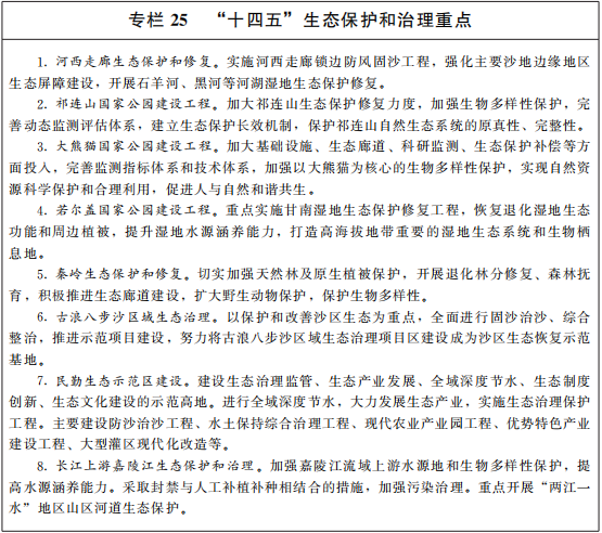 全面改善祁連(lian)(lian)山生(sheng)(sheng)態(tai)(tai)。開(kai)展祁連(lian)(lian)山及(ji)沿(yan)山地區山水林(lin)田(tian)湖草沙(sha)綜合治(zhi)理。加強(qiang)林(lin)草植被建(jian)(jian)設(she),提高林(lin)草覆蓋率,減(jian)(jian)少水土流失。實施沙(sha)化(hua)土地封禁保(bao)(bao)護(hu)、固(gu)沙(sha)防沙(sha)治(zhi)沙(sha)工程,構建(jian)(jian)河(he)西走(zou)廊荒漠化(hua)、沙(sha)化(hua)綜合防控(kong)體(ti)系。建(jian)(jian)立野生(sheng)(sheng)動(dong)物監測體(ti)系,加大瀕危物種(zhong)及(ji)其棲息(xi)地保(bao)(bao)護(hu),保(bao)(bao)護(hu)生(sheng)(sheng)物多樣性。對祁連(lian)(lian)山核心(xin)區采取自(zi)然休養、減(jian)(jian)畜禁牧(mu)等措施,引(yin)導超(chao)載人口有序轉移,減(jian)(jian)少人為擾動(dong),減(jian)(jian)輕(qing)自(zi)然生(sheng)(sheng)態(tai)(tai)系統承(cheng)載壓(ya)力,提升生(sheng)(sheng)態(tai)(tai)自(zi)我修(xiu)復(fu)(fu)功能(neng)。強(qiang)化(hua)祁連(lian)(lian)山礦(kuang)山生(sheng)(sheng)態(tai)(tai)修(xiu)復(fu)(fu)治(zhi)理,嚴控(kong)水電(dian)開(kai)發(fa)(fa),加強(qiang)對現(xian)有水電(dian)設(she)施下(xia)泄生(sheng)(sheng)態(tai)(tai)流量監管(guan),依法依規(gui)推進(jin)旅游開(kai)發(fa)(fa)。實施八步(bu)沙(sha)區域(yu)生(sheng)(sheng)態(tai)(tai)保(bao)(bao)護(hu)與修(xiu)復(fu)(fu),建(jian)(jian)設(she)民勤生(sheng)(sheng)態(tai)(tai)示范區,加快推進(jin)黑河(he)、疏勒河(he)、石(shi)羊河(he)等重點流域(yu)生(sheng)(sheng)態(tai)(tai)治(zhi)理與修(xiu)復(fu)(fu)。