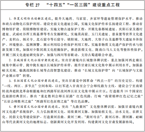 保護(hu)(hu)(hu)傳(chuan)承(cheng)弘揚優秀(xiu)(xiu)傳(chuan)統(tong)文(wen)(wen)(wen)(wen)化(hua)(hua)(hua)。加快華夏文(wen)(wen)(wen)(wen)明傳(chuan)承(cheng)創(chuang)新區(qu)和(he)(he)(he)(he)(he)長(chang)城(cheng)、長(chang)征、黃(huang)河等國家文(wen)(wen)(wen)(wen)化(hua)(hua)(hua)公園甘肅(su)段“一(yi)區(qu)三園”建(jian)設,重點推進管(guan)控(kong)保護(hu)(hu)(hu)、主題展(zhan)示、文(wen)(wen)(wen)(wen)旅融合、傳(chuan)統(tong)利用(yong)“四(si)類(lei)功能區(qu)”和(he)(he)(he)(he)(he)保護(hu)(hu)(hu)傳(chuan)承(cheng)、研(yan)(yan)究(jiu)發掘(jue)(jue)、環境配套(tao)、文(wen)(wen)(wen)(wen)旅融合、數字再現“五大(da)(da)工程(cheng)”建(jian)設。用(yong)好(hao)甘肅(su)先(xian)(xian)(xian)祖(zu)、先(xian)(xian)(xian)賢、先(xian)(xian)(xian)河、先(xian)(xian)(xian)烈(lie)文(wen)(wen)(wen)(wen)化(hua)(hua)(hua),實施(shi)(shi)優秀(xiu)(xiu)傳(chuan)統(tong)文(wen)(wen)(wen)(wen)化(hua)(hua)(hua)浸潤工程(cheng),放大(da)(da)歷史、人文(wen)(wen)(wen)(wen)資源(yuan)價(jia)值。深(shen)度參(can)與實施(shi)(shi)“中華文(wen)(wen)(wen)(wen)明探源(yuan)工程(cheng)”和(he)(he)(he)(he)(he)“考(kao)古(gu)中國”重大(da)(da)項(xiang)目,全面推進文(wen)(wen)(wen)(wen)化(hua)(hua)(hua)遺產系統(tong)保護(hu)(hu)(hu)。實施(shi)(shi)文(wen)(wen)(wen)(wen)化(hua)(hua)(hua)提升(sheng)工程(cheng),系統(tong)挖掘(jue)(jue)整理(li)甘肅(su)歷史文(wen)(wen)(wen)(wen)化(hua)(hua)(hua)、地(di)域文(wen)(wen)(wen)(wen)化(hua)(hua)(hua)和(he)(he)(he)(he)(he)少數民族文(wen)(wen)(wen)(wen)化(hua)(hua)(hua),強化(hua)(hua)(hua)重要(yao)文(wen)(wen)(wen)(wen)化(hua)(hua)(hua)和(he)(he)(he)(he)(he)自然遺產、非物質文(wen)(wen)(wen)(wen)化(hua)(hua)(hua)遺產系統(tong)性保護(hu)(hu)(hu),加強各民族優秀(xiu)(xiu)傳(chuan)統(tong)手工藝保護(hu)(hu)(hu)和(he)(he)(he)(he)(he)傳(chuan)承(cheng)。弘揚敦(dun)煌文(wen)(wen)(wen)(wen)化(hua)(hua)(hua),推動(dong)敦(dun)煌文(wen)(wen)(wen)(wen)獻回(hui)歸整理(li)、保存修復(fu)、研(yan)(yan)究(jiu)出版工作,把敦(dun)煌研(yan)(yan)究(jiu)院建(jian)設成為世(shi)界文(wen)(wen)(wen)(wen)化(hua)(hua)(hua)遺產保護(hu)(hu)(hu)典范和(he)(he)(he)(he)(he)敦(dun)煌學研(yan)(yan)究(jiu)高地(di),鞏固提升(sheng)敦(dun)煌學研(yan)(yan)究(jiu)話語權。實施(shi)(shi)革命文(wen)(wen)(wen)(wen)物保護(hu)(hu)(hu)利用(yong)工程(cheng)和(he)(he)(he)(he)(he)古(gu)籍整理(li)工程(cheng)。建(jian)設好(hao)紅色(se)文(wen)(wen)(wen)(wen)化(hua)(hua)(hua)教育(yu)基地(di)。