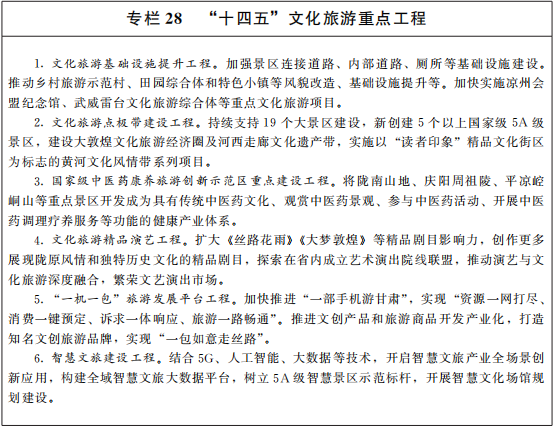 推(tui)動文(wen)(wen)(wen)(wen)(wen)化產(chan)業(ye)(ye)和(he)(he)旅(lv)(lv)(lv)游(you)(you)(you)(you)產(chan)業(ye)(ye)加快發(fa)(fa)(fa)展(zhan)。深度開發(fa)(fa)(fa)旅(lv)(lv)(lv)游(you)(you)(you)(you)資源,創新旅(lv)(lv)(lv)游(you)(you)(you)(you)業(ye)(ye)態,統籌線下線上旅(lv)(lv)(lv)游(you)(you)(you)(you),推(tui)出(chu)高(gao)端多元旅(lv)(lv)(lv)游(you)(you)(you)(you)產(chan)品(pin)(pin)。推(tui)動文(wen)(wen)(wen)(wen)(wen)化旅(lv)(lv)(lv)游(you)(you)(you)(you)與康養、美(mei)麗鄉村(cun)(cun)、體育(yu)(yu)、金融等產(chan)業(ye)(ye)融合(he)(he)發(fa)(fa)(fa)展(zhan),支持各類文(wen)(wen)(wen)(wen)(wen)化企業(ye)(ye)打造旅(lv)(lv)(lv)游(you)(you)(you)(you)駐場(chang)演出(chu)項目,有效(xiao)提升(sheng)(sheng)旅(lv)(lv)(lv)游(you)(you)(you)(you)品(pin)(pin)質。進(jin)一(yi)(yi)(yi)步擴大(da)公(gong)祭伏羲大(da)典國(guo)際影(ying)響(xiang)(xiang)力(li)(li),打造黃河(he)流域中華人文(wen)(wen)(wen)(wen)(wen)始祖發(fa)(fa)(fa)源地文(wen)(wen)(wen)(wen)(wen)化品(pin)(pin)牌。放(fang)(fang)大(da)絲綢之(zhi)路(lu)(敦(dun)煌)文(wen)(wen)(wen)(wen)(wen)化博覽會平(ping)臺(tai)綜合(he)(he)效(xiao)應(ying),辦好敦(dun)煌行·絲綢之(zhi)路(lu)國(guo)際旅(lv)(lv)(lv)游(you)(you)(you)(you)節(jie)、“一(yi)(yi)(yi)帶一(yi)(yi)(yi)路(lu)”美(mei)麗鄉村(cun)(cun)論(lun)壇等重大(da)節(jie)會。打造更多世界級精品(pin)(pin)景(jing)區、精品(pin)(pin)線路(lu)、國(guo)家級休閑城市。創建(jian)一(yi)(yi)(yi)批5A級、4A級景(jing)區和(he)(he)國(guo)家級、省級度假(jia)區。發(fa)(fa)(fa)展(zhan)全域旅(lv)(lv)(lv)游(you)(you)(you)(you),促進(jin)紅色(se)旅(lv)(lv)(lv)游(you)(you)(you)(you)和(he)(he)鄉村(cun)(cun)旅(lv)(lv)(lv)游(you)(you)(you)(you)提檔升(sheng)(sheng)級。有序發(fa)(fa)(fa)展(zhan)生(sheng)態觀光旅(lv)(lv)(lv)游(you)(you)(you)(you),推(tui)動生(sheng)態保護與旅(lv)(lv)(lv)游(you)(you)(you)(you)發(fa)(fa)(fa)展(zhan)相得益彰。大(da)力(li)(li)發(fa)(fa)(fa)展(zhan)假(jia)日經濟(ji)和(he)(he)冬日經濟(ji),加快發(fa)(fa)(fa)展(zhan)健身休閑和(he)(he)體育(yu)(yu)競賽表演產(chan)業(ye)(ye),提升(sheng)(sheng)高(gao)原特色(se)體育(yu)(yu)產(chan)業(ye)(ye)和(he)(he)冰雪運動影(ying)響(xiang)(xiang)力(li)(li)。開發(fa)(fa)(fa)具有地方(fang)特色(se)的文(wen)(wen)(wen)(wen)(wen)創產(chan)品(pin)(pin)和(he)(he)紀念(nian)品(pin)(pin)。拓展(zhan)國(guo)際旅(lv)(lv)(lv)游(you)(you)(you)(you)市場(chang),提升(sheng)(sheng)對境(jing)外游(you)(you)(you)(you)客吸引(yin)力(li)(li)。全面開放(fang)(fang)旅(lv)(lv)(lv)游(you)(you)(you)(you)市場(chang),建(jian)設和(he)(he)引(yin)進(jin)一(yi)(yi)(yi)批國(guo)內外知名旅(lv)(lv)(lv)游(you)(you)(you)(you)企業(ye)(ye)和(he)(he)管理服(fu)務品(pin)(pin)牌。放(fang)(fang)大(da)文(wen)(wen)(wen)(wen)(wen)化旅(lv)(lv)(lv)游(you)(you)(you)(you)業(ye)(ye)綜合(he)(he)效(xiao)應(ying)。“十四(si)五(wu)”期間,力(li)(li)爭旅(lv)(lv)(lv)游(you)(you)(you)(you)綜合(he)(he)收入年均增長(chang)20%以上。