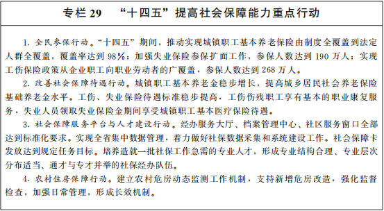健(jian)全(quan)多(duo)層(ceng)次社(she)會(hui)保(bao)(bao)(bao)(bao)(bao)障(zhang)體(ti)(ti)系(xi)。著(zhu)力(li)擴大各類社(she)會(hui)保(bao)(bao)(bao)(bao)(bao)險(xian)(xian)(xian)覆蓋(gai)面(mian),努力(li)做(zuo)到(dao)應(ying)保(bao)(bao)(bao)(bao)(bao)盡保(bao)(bao)(bao)(bao)(bao)。按(an)照覆蓋(gai)全(quan)民(min)、統(tong)(tong)(tong)籌(chou)城鄉、公(gong)平(ping)統(tong)(tong)(tong)一、可持續的(de)要(yao)求,構建(jian)與物價、收入(ru)水平(ping)相掛鉤的(de)社(she)會(hui)保(bao)(bao)(bao)(bao)(bao)障(zhang)待遇(yu)調整機(ji)制(zhi)(zhi)。配(pei)合(he)推(tui)進養(yang)(yang)老(lao)保(bao)(bao)(bao)(bao)(bao)險(xian)(xian)(xian)全(quan)國統(tong)(tong)(tong)籌(chou),提(ti)升養(yang)(yang)老(lao)保(bao)(bao)(bao)(bao)(bao)險(xian)(xian)(xian)保(bao)(bao)(bao)(bao)(bao)障(zhang)水平(ping)。提(ti)高基本醫(yi)療(liao)保(bao)(bao)(bao)(bao)(bao)險(xian)(xian)(xian)、工傷(shang)保(bao)(bao)(bao)(bao)(bao)險(xian)(xian)(xian)、失業(ye)保(bao)(bao)(bao)(bao)(bao)險(xian)(xian)(xian)統(tong)(tong)(tong)籌(chou)能(neng)(neng)力(li)和層(ceng)次。建(jian)立全(quan)省統(tong)(tong)(tong)一的(de)工傷(shang)認(ren)定、費率調整、待遇(yu)支付和勞動能(neng)(neng)力(li)鑒(jian)定制(zhi)(zhi)度(du)(du)(du)(du),提(ti)高工傷(shang)職工重返工作崗(gang)位比例,建(jian)立“先(xian)康復、后評殘”制(zhi)(zhi)度(du)(du)(du)(du)。深化(hua)醫(yi)療(liao)保(bao)(bao)(bao)(bao)(bao)障(zhang)制(zhi)(zhi)度(du)(du)(du)(du)改(gai)革,建(jian)立重特大疾(ji)病保(bao)(bao)(bao)(bao)(bao)障(zhang)和救(jiu)助(zhu)機(ji)制(zhi)(zhi)。穩步推(tui)進長(chang)期護理保(bao)(bao)(bao)(bao)(bao)險(xian)(xian)(xian),積極(ji)發展(zhan)商(shang)業(ye)醫(yi)療(liao)保(bao)(bao)(bao)(bao)(bao)險(xian)(xian)(xian),支持醫(yi)療(liao)互(hu)(hu)助(zhu)有序(xu)發展(zhan)。大力(li)發展(zhan)職工互(hu)(hu)助(zhu)補充保(bao)(bao)(bao)(bao)(bao)險(xian)(xian)(xian)。大力(li)發展(zhan)企業(ye)年(nian)(nian)金、職業(ye)年(nian)(nian)金、個人(ren)儲(chu)蓄性養(yang)(yang)老(lao)保(bao)(bao)(bao)(bao)(bao)險(xian)(xian)(xian)和商(shang)業(ye)養(yang)(yang)老(lao)保(bao)(bao)(bao)(bao)(bao)險(xian)(xian)(xian)。科學制(zhi)(zhi)定低保(bao)(bao)(bao)(bao)(bao)標準,兜(dou)牢(lao)基本生活底線。加快建(jian)立多(duo)主體(ti)(ti)供給、多(duo)渠道(dao)保(bao)(bao)(bao)(bao)(bao)障(zhang)、租購并舉(ju)的(de)住房(fang)制(zhi)(zhi)度(du)(du)(du)(du),改(gai)革住房(fang)公(gong)積金制(zhi)(zhi)度(du)(du)(du)(du)。統(tong)(tong)(tong)籌(chou)完善社(she)會(hui)救(jiu)助(zhu)、社(she)會(hui)福利、慈善事業(ye)、優撫(fu)安置(zhi)等(deng)制(zhi)(zhi)度(du)(du)(du)(du)。保(bao)(bao)(bao)(bao)(bao)障(zhang)婦(fu)女兒童合(he)法權益,健(jian)全(quan)老(lao)年(nian)(nian)人(ren)、殘疾(ji)人(ren)關愛服務(wu)(wu)體(ti)(ti)系(xi)和設施。健(jian)全(quan)退役(yi)軍人(ren)工作體(ti)(ti)系(xi)和保(bao)(bao)(bao)(bao)(bao)障(zhang)制(zhi)(zhi)度(du)(du)(du)(du),創新移(yi)交安置(zhi)機(ji)制(zhi)(zhi),提(ti)升安置(zhi)質量。提(ti)升殯葬服務(wu)(wu)保(bao)(bao)(bao)(bao)(bao)障(zhang)能(neng)(neng)力(li)。