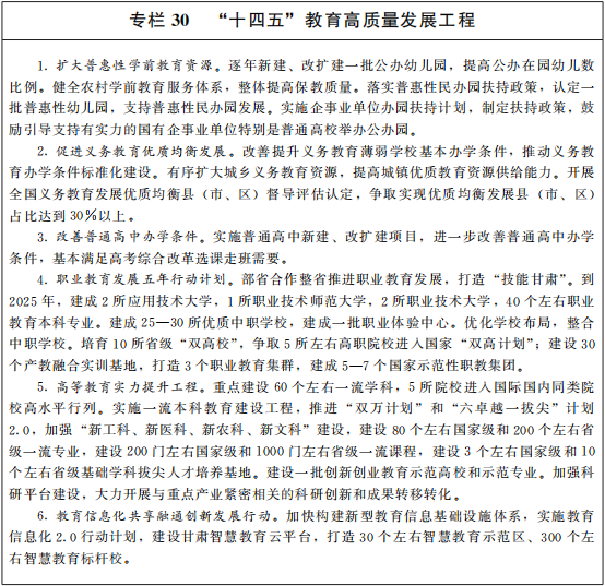 發(fa)(fa)展(zhan)(zhan)高(gao)(gao)(gao)(gao)質量(liang)教(jiao)(jiao)(jiao)(jiao)(jiao)(jiao)(jiao)(jiao)育(yu)(yu)(yu)(yu)(yu)(yu)(yu)。全面貫徹(che)黨的教(jiao)(jiao)(jiao)(jiao)(jiao)(jiao)(jiao)(jiao)育(yu)(yu)(yu)(yu)(yu)(yu)(yu)方針,堅持(chi)(chi)立德(de)樹人(ren)(ren),加強師德(de)師風建(jian)(jian)(jian)設(she),培(pei)養德(de)智(zhi)體(ti)美(mei)(mei)勞(lao)全面發(fa)(fa)展(zhan)(zhan)的社會(hui)主義(yi)建(jian)(jian)(jian)設(she)者和(he)(he)(he)接班人(ren)(ren)。深(shen)入(ru)實施(shi)教(jiao)(jiao)(jiao)(jiao)(jiao)(jiao)(jiao)(jiao)育(yu)(yu)(yu)(yu)(yu)(yu)(yu)強國(guo)推(tui)(tui)(tui)進工(gong)(gong)程(cheng),改(gai)善(shan)提(ti)升(sheng)(sheng)義(yi)務(wu)教(jiao)(jiao)(jiao)(jiao)(jiao)(jiao)(jiao)(jiao)育(yu)(yu)(yu)(yu)(yu)(yu)(yu)薄(bo)弱(ruo)學(xue)校(xiao)基本辦(ban)學(xue)條件,合理配置城(cheng)鄉(xiang)教(jiao)(jiao)(jiao)(jiao)(jiao)(jiao)(jiao)(jiao)育(yu)(yu)(yu)(yu)(yu)(yu)(yu)資(zi)源(yuan),大(da)力(li)促進教(jiao)(jiao)(jiao)(jiao)(jiao)(jiao)(jiao)(jiao)育(yu)(yu)(yu)(yu)(yu)(yu)(yu)公平。推(tui)(tui)(tui)動(dong)(dong)各(ge)級各(ge)類教(jiao)(jiao)(jiao)(jiao)(jiao)(jiao)(jiao)(jiao)育(yu)(yu)(yu)(yu)(yu)(yu)(yu)高(gao)(gao)(gao)(gao)質量(liang)發(fa)(fa)展(zhan)(zhan),完(wan)善(shan)普惠性學(xue)前教(jiao)(jiao)(jiao)(jiao)(jiao)(jiao)(jiao)(jiao)育(yu)(yu)(yu)(yu)(yu)(yu)(yu)保障(zhang)(zhang)機(ji)制(zhi)(zhi),實施(shi)普惠性學(xue)前教(jiao)(jiao)(jiao)(jiao)(jiao)(jiao)(jiao)(jiao)育(yu)(yu)(yu)(yu)(yu)(yu)(yu)資(zi)源(yuan)擴容工(gong)(gong)程(cheng),擴大(da)公辦(ban)資(zi)源(yuan)、支(zhi)持(chi)(chi)和(he)(he)(he)規范社會(hui)辦(ban)園,加大(da)學(xue)位(wei)供(gong)給。推(tui)(tui)(tui)進義(yi)務(wu)教(jiao)(jiao)(jiao)(jiao)(jiao)(jiao)(jiao)(jiao)育(yu)(yu)(yu)(yu)(yu)(yu)(yu)優(you)質均衡發(fa)(fa)展(zhan)(zhan)和(he)(he)(he)城(cheng)鄉(xiang)一體(ti)化(hua),到2025年(nian)九年(nian)義(yi)務(wu)教(jiao)(jiao)(jiao)(jiao)(jiao)(jiao)(jiao)(jiao)育(yu)(yu)(yu)(yu)(yu)(yu)(yu)鞏(gong)固率達到97%以(yi)上。促進高(gao)(gao)(gao)(gao)中階段學(xue)校(xiao)多樣(yang)化(hua)發(fa)(fa)展(zhan)(zhan)。鼓勵各(ge)方力(li)量(liang)參(can)與(yu)興(xing)辦(ban)職業(ye)(ye)(ye)教(jiao)(jiao)(jiao)(jiao)(jiao)(jiao)(jiao)(jiao)育(yu)(yu)(yu)(yu)(yu)(yu)(yu),支(zhi)持(chi)(chi)蘭(lan)(lan)州(zhou)新區(qu)職教(jiao)(jiao)(jiao)(jiao)(jiao)(jiao)(jiao)(jiao)園區(qu)打(da)造(zao)技能(neng)培(pei)訓示范區(qu),實現中等(deng)職業(ye)(ye)(ye)教(jiao)(jiao)(jiao)(jiao)(jiao)(jiao)(jiao)(jiao)育(yu)(yu)(yu)(yu)(yu)(yu)(yu)、高(gao)(gao)(gao)(gao)等(deng)職業(ye)(ye)(ye)教(jiao)(jiao)(jiao)(jiao)(jiao)(jiao)(jiao)(jiao)育(yu)(yu)(yu)(yu)(yu)(yu)(yu)和(he)(he)(he)職業(ye)(ye)(ye)培(pei)訓協(xie)調發(fa)(fa)展(zhan)(zhan),構(gou)建(jian)(jian)(jian)縱向(xiang)(xiang)貫通、橫向(xiang)(xiang)融(rong)通、學(xue)歷教(jiao)(jiao)(jiao)(jiao)(jiao)(jiao)(jiao)(jiao)育(yu)(yu)(yu)(yu)(yu)(yu)(yu)與(yu)培(pei)訓并(bing)重的現代職業(ye)(ye)(ye)教(jiao)(jiao)(jiao)(jiao)(jiao)(jiao)(jiao)(jiao)育(yu)(yu)(yu)(yu)(yu)(yu)(yu)體(ti)系,打(da)造(zao)“技能(neng)甘肅”。實施(shi)高(gao)(gao)(gao)(gao)等(deng)教(jiao)(jiao)(jiao)(jiao)(jiao)(jiao)(jiao)(jiao)育(yu)(yu)(yu)(yu)(yu)(yu)(yu)振興(xing)行動(dong)(dong)計劃,支(zhi)持(chi)(chi)蘭(lan)(lan)州(zhou)大(da)學(xue)提(ti)升(sheng)(sheng)“雙一流(liu)”建(jian)(jian)(jian)設(she)水(shui)(shui)平,支(zhi)持(chi)(chi)省內高(gao)(gao)(gao)(gao)校(xiao)加強“雙一流(liu)”建(jian)(jian)(jian)設(she)。優(you)化(hua)高(gao)(gao)(gao)(gao)校(xiao)類型(xing)布局(ju)和(he)(he)(he)高(gao)(gao)(gao)(gao)等(deng)教(jiao)(jiao)(jiao)(jiao)(jiao)(jiao)(jiao)(jiao)育(yu)(yu)(yu)(yu)(yu)(yu)(yu)學(xue)科專(zhuan)業(ye)(ye)(ye)結構(gou),加強一流(liu)本科教(jiao)(jiao)(jiao)(jiao)(jiao)(jiao)(jiao)(jiao)育(yu)(yu)(yu)(yu)(yu)(yu)(yu),加強理工(gong)(gong)農醫類緊缺人(ren)(ren)才培(pei)養,提(ti)升(sheng)(sheng)研究生教(jiao)(jiao)(jiao)(jiao)(jiao)(jiao)(jiao)(jiao)育(yu)(yu)(yu)(yu)(yu)(yu)(yu)質量(liang),推(tui)(tui)(tui)動(dong)(dong)實現高(gao)(gao)(gao)(gao)等(deng)教(jiao)(jiao)(jiao)(jiao)(jiao)(jiao)(jiao)(jiao)育(yu)(yu)(yu)(yu)(yu)(yu)(yu)高(gao)(gao)(gao)(gao)質量(liang)發(fa)(fa)展(zhan)(zhan)。支(zhi)持(chi)(chi)和(he)(he)(he)規范民辦(ban)教(jiao)(jiao)(jiao)(jiao)(jiao)(jiao)(jiao)(jiao)育(yu)(yu)(yu)(yu)(yu)(yu)(yu),完(wan)善(shan)特殊教(jiao)(jiao)(jiao)(jiao)(jiao)(jiao)(jiao)(jiao)育(yu)(yu)(yu)(yu)(yu)(yu)(yu)、專(zhuan)門教(jiao)(jiao)(jiao)(jiao)(jiao)(jiao)(jiao)(jiao)育(yu)(yu)(yu)(yu)(yu)(yu)(yu)保障(zhang)(zhang)機(ji)制(zhi)(zhi)。全面建(jian)(jian)(jian)設(she)高(gao)(gao)(gao)(gao)素質專(zhuan)業(ye)(ye)(ye)化(hua)創新型(xing)教(jiao)(jiao)(jiao)(jiao)(jiao)(jiao)(jiao)(jiao)師隊伍,改(gai)善(shan)鄉(xiang)村教(jiao)(jiao)(jiao)(jiao)(jiao)(jiao)(jiao)(jiao)師教(jiao)(jiao)(jiao)(jiao)(jiao)(jiao)(jiao)(jiao)學(xue)生活條件。持(chi)(chi)續提(ti)升(sheng)(sheng)鄉(xiang)村教(jiao)(jiao)(jiao)(jiao)(jiao)(jiao)(jiao)(jiao)育(yu)(yu)(yu)(yu)(yu)(yu)(yu)保障(zhang)(zhang)能(neng)力(li)和(he)(he)(he)水(shui)(shui)平,振興(xing)鄉(xiang)村教(jiao)(jiao)(jiao)(jiao)(jiao)(jiao)(jiao)(jiao)育(yu)(yu)(yu)(yu)(yu)(yu)(yu)。完(wan)善(shan)家庭學(xue)校(xiao)社會(hui)協(xie)同育(yu)(yu)(yu)(yu)(yu)(yu)(yu)人(ren)(ren)機(ji)制(zhi)(zhi),深(shen)入(ru)推(tui)(tui)(tui)進“五育(yu)(yu)(yu)(yu)(yu)(yu)(yu)并(bing)舉”,發(fa)(fa)展(zhan)(zhan)素質教(jiao)(jiao)(jiao)(jiao)(jiao)(jiao)(jiao)(jiao)育(yu)(yu)(yu)(yu)(yu)(yu)(yu),重視(shi)青少(shao)年(nian)身體(ti)素質和(he)(he)(he)心理健(jian)康教(jiao)(jiao)(jiao)(jiao)(jia