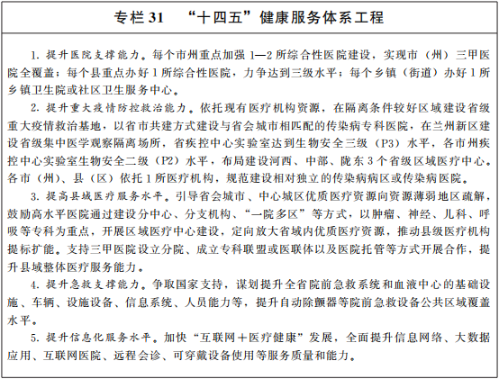 推(tui)動(dong)健(jian)(jian)(jian)(jian)康(kang)(kang)(kang)甘肅建(jian)(jian)(jian)設(she)(she)(she)。堅(jian)持黨(dang)的衛生(sheng)(sheng)(sheng)與健(jian)(jian)(jian)(jian)康(kang)(kang)(kang)工作方針,把(ba)保(bao)障人民(min)健(jian)(jian)(jian)(jian)康(kang)(kang)(kang)放在優先(xian)發(fa)展的戰略位置(zhi),推(tui)進以(yi)治(zhi)病為中心(xin)向以(yi)人民(min)健(jian)(jian)(jian)(jian)康(kang)(kang)(kang)為中心(xin)轉變。建(jian)(jian)(jian)立穩定的公(gong)共(gong)(gong)衛生(sheng)(sheng)(sheng)事(shi)業投入(ru)機制(zhi)。實施(shi)健(jian)(jian)(jian)(jian)康(kang)(kang)(kang)服務(wu)體(ti)系(xi)(xi)建(jian)(jian)(jian)設(she)(she)(she)工程,加(jia)強(qiang)(qiang)省(sheng)市縣醫(yi)(yi)(yi)(yi)(yi)療衛生(sheng)(sheng)(sheng)機構(gou)體(ti)系(xi)(xi)建(jian)(jian)(jian)設(she)(she)(she),提(ti)(ti)(ti)(ti)(ti)升(sheng)醫(yi)(yi)(yi)(yi)(yi)療衛生(sheng)(sheng)(sheng)服務(wu)能力(li)(li),提(ti)(ti)(ti)(ti)(ti)高(gao)基(ji)礎設(she)(she)(she)施(shi)、醫(yi)(yi)(yi)(yi)(yi)療設(she)(she)(she)備和(he)(he)醫(yi)(yi)(yi)(yi)(yi)務(wu)人員配置(zhi)水平(ping),加(jia)強(qiang)(qiang)公(gong)立醫(yi)(yi)(yi)(yi)(yi)院(yuan)建(jian)(jian)(jian)設(she)(she)(she)和(he)(he)管(guan)理考核(he),不斷(duan)提(ti)(ti)(ti)(ti)(ti)高(gao)服務(wu)質量。改革完善(shan)疾(ji)(ji)病預防(fang)(fang)控(kong)制(zhi)體(ti)系(xi)(xi),提(ti)(ti)(ti)(ti)(ti)高(gao)疾(ji)(ji)控(kong)服務(wu)能力(li)(li)。提(ti)(ti)(ti)(ti)(ti)升(sheng)公(gong)立醫(yi)(yi)(yi)(yi)(yi)院(yuan)傳染病救治(zhi)能力(li)(li),加(jia)強(qiang)(qiang)實驗室檢(jian)測網(wang)絡建(jian)(jian)(jian)設(she)(she)(she)。健(jian)(jian)(jian)(jian)全(quan)(quan)公(gong)共(gong)(gong)衛生(sheng)(sheng)(sheng)應(ying)急物(wu)資(zi)保(bao)障體(ti)系(xi)(xi),強(qiang)(qiang)化(hua)各級應(ying)急醫(yi)(yi)(yi)(yi)(yi)療物(wu)資(zi)儲(chu)備。健(jian)(jian)(jian)(jian)全(quan)(quan)重大(da)疫情(qing)防(fang)(fang)控(kong)和(he)(he)公(gong)共(gong)(gong)衛生(sheng)(sheng)(sheng)應(ying)急管(guan)理體(ti)制(zhi)機制(zhi)。大(da)力(li)(li)發(fa)展中醫(yi)(yi)(yi)(yi)(yi)藥(yao)和(he)(he)民(min)族醫(yi)(yi)(yi)(yi)(yi)藥(yao),推(tui)進中醫(yi)(yi)(yi)(yi)(yi)藥(yao)健(jian)(jian)(jian)(jian)康(kang)(kang)(kang)服務(wu)多業態(tai)融合發(fa)展。持續推(tui)進“互聯網(wang)+醫(yi)(yi)(yi)(yi)(yi)療健(jian)(jian)(jian)(jian)康(kang)(kang)(kang)”發(fa)展,提(ti)(ti)(ti)(ti)(ti)升(sheng)健(jian)(jian)(jian)(jian)康(kang)(kang)(kang)教(jiao)育(yu)、慢病管(guan)理和(he)(he)殘疾(ji)(ji)康(kang)(kang)(kang)復服務(wu)質量,重視精(jing)神衛生(sheng)(sheng)(sheng)、心(xin)理健(jian)(jian)(jian)(jian)康(kang)(kang)(kang)、重點(dian)人群管(guan)理和(he)(he)職業健(jian)(jian)(jian)(jian)康(kang)(kang)(kang)。深入(ru)開展愛國衛生(sheng)(sheng)(sheng)運動(dong),促進養(yang)成文明健(jian)(jian)(jian)(jian)康(kang)(kang)(kang)生(sheng)(sheng)(sheng)活方式。加(jia)強(qiang)(qiang)公(gong)立醫(yi)(yi)(yi)(yi)(yi)院(yuan)建(jian)(jian)(jian)設(she)(she)(she)和(he)(he)管(guan)理考核(he)。完善(shan)醫(yi)(yi)(yi)(yi)(yi)保(bao)基(ji)金總(zong)額預算管(guan)理。推(tui)動(dong)構(gou)建(jian)(jian)(jian)醫(yi)(yi)(yi)(yi)(yi)療、醫(yi)(yi)(yi)(yi)(yi)保(bao)、醫(yi)(yi)(yi)(yi)(yi)藥(yao)“三醫(yi)(yi)(yi)(yi)(yi)聯動(dong)”工作機制(zhi)。構(gou)建(jian)(jian)(jian)高(gao)水平(ping)全(quan)(quan)民(min)健(jian)(jian)(jian)(jian)身(shen)公(gong)共(gong)(gong)服務(wu)體(ti)系(xi)(xi),統籌建(jian)(jian)(jian)設(she)(she)(she)全(quan)(quan)民(min)健(jian)(jian)(jian)(jian)身(shen)場地(di)和(he)(he)設(she)(she)(she)施(shi),完善(shan)青(qing)少(shao)年(nian)體(ti)質健(jian)(jian)(jian)(jian)康(kang)(kang)(kang)監(jian)測體(ti)系(xi)(xi),深入(ru)開展群眾體(ti)育(yu)活動(dong)。提(ti)(ti)(ti)(ti)(ti)高(gao)競技體(ti)育(yu)水平(ping),加(jia)快建(jian)(jian)(jian)設(she)(she)(she)臨(lin)洮、白銀等高(gao)水平(ping)體(ti)育(yu)訓練基(ji)地(di)。