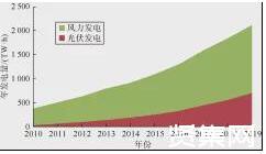 圖5 2010—2019年全球(qiu)光伏(fu)發電與風力發電量