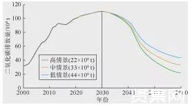 按(an)照二(er)氧化碳(tan)(tan)(tan)排(pai)(pai)(pai)(pai)放(fang)峰值的(de)減(jian)排(pai)(pai)(pai)(pai)程度(du),本(ben)文分低(di)、中、高(gao)3種情景(jing)(jing)預測中國2060年碳(tan)(tan)(tan)排(pai)(pai)(pai)(pai)放(fang)量(liang)(liang)(見圖7)。低(di)情景(jing)(jing)下(xia),二(er)氧化碳(tan)(tan)(tan)減(jian)排(pai)(pai)(pai)(pai)至(zhi)峰值的(de)40%,排(pai)(pai)(pai)(pai)放(fang)量(liang)(liang)降低(di)至(zhi)44108 t;中情景(jing)(jing)下(xia),二(er)氧化碳(tan)(tan)(tan)減(jian)排(pai)(pai)(pai)(pai)至(zhi)峰值的(de)30%,排(pai)(pai)(pai)(pai)放(fang)量(liang)(liang)降低(di)至(zhi)33108 t;高(gao)情景(jing)(jing)下(xia),二(er)氧化碳(tan)(tan)(tan)減(jian)排(pai)(pai)(pai)(pai)至(zhi)峰值的(de)20%,排(pai)(pai)(pai)(pai)放(fang)量(liang)(liang)降低(di)至(zhi)22108 t。