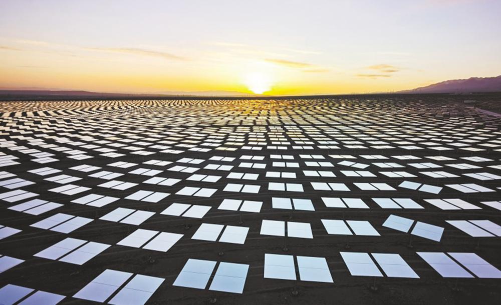日落的余暉(hui)下(xia),矗立(li)在戈(ge)壁深處的定(ding)日鏡蔚(yu)為壯觀。(青海中控太陽能技術有限公司(si)供圖)