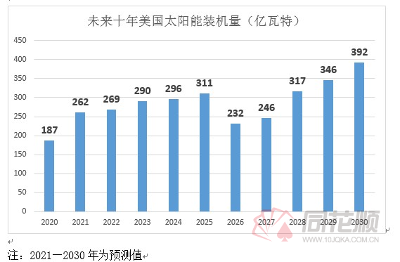 彭博今年(nian)早些(xie)時候(hou)預計(ji),2021至2030年(nian),全美(mei)公(gong)共(gong)事業規(gui)模的(de)太陽能(neng)裝機(ji)總(zong)容量(liang)將達到2040億瓦(wa)特(te),小規(gui)模光伏發電(dian)裝機(ji)容量(liang)將增加830億瓦(wa)特(te),合計(ji)2870億瓦(wa)特(te);相比(bi)之下,未來十年(nian)間(jian)風力發電(dian)量(liang)將僅增加1150億瓦(wa)特(te),不到光伏發電(dian)量(liang)的(de)一(yi)半。