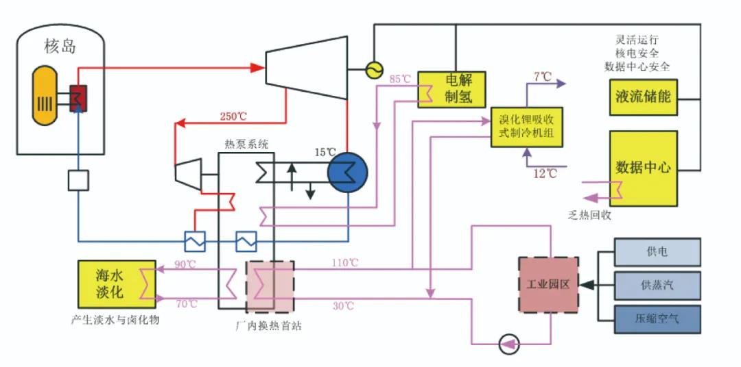 針對沿海地區(qu)場景,還可(ke)以(yi)(yi)推廣核(he)(he)能(neng)(neng)綜(zong)合利用系(xi)(xi)統,通過對核(he)(he)電站的熱(re)力系(xi)(xi)統進行(xing)(xing)創(chuang)新,實現(xian)發(fa)電、制(zhi)氫、海水(shui)(shui)淡(dan)化(hua)、供熱(re)、制(zhi)冷、供汽、儲(chu)能(neng)(neng)等(deng)(deng)多種功能(neng)(neng)綜(zong)合協同(tong)。核(he)(he)能(neng)(neng)裂變(bian)后釋放(fang)的能(neng)(neng)量最初就是以(yi)(yi)熱(re)能(neng)(neng)的形式展現(xian),對核(he)(he)熱(re)能(neng)(neng)直接(jie)進行(xing)(xing)綜(zong)合利用,可(ke)以(yi)(yi)有(you)效(xiao)提高能(neng)(neng)源系(xi)(xi)統的經濟性。此(ci)外核(he)(he)能(neng)(neng)制(zhi)氫具有(you)無(wu)溫室(shi)氣體排放(fang)、高效(xiao)等(deng)(deng)諸多優勢(shi),核(he)(he)能(neng)(neng)海水(shui)(shui)淡(dan)化(hua)可(ke)以(yi)(yi)保(bao)障沿海缺乏地區(qu)的用水(shui)(shui)安全,核(he)(he)能(neng)(neng)供熱(re)、制(zhi)冷可(ke)以(yi)(yi)提供清(qing)潔經濟的居民(min)供暖(nuan)和工業用熱(re)、用冷,滿足地區(qu)經濟發(fa)展和人民(min)需(xu)求的各種用能(neng)(neng)形式。