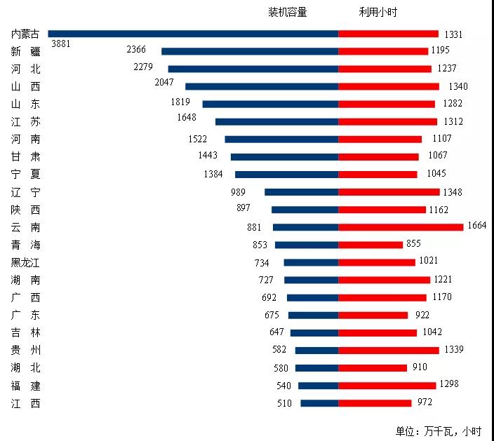 圖3 1-6月(yue)份風(feng)電裝機較(jiao)多省份風(feng)電裝機容量和設(she)備(bei)利(li)用小時