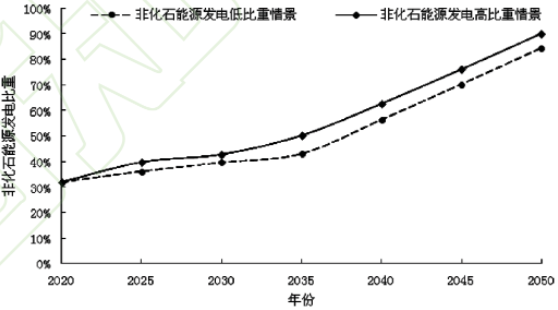 結合非(fei)(fei)化(hua)石(shi)能(neng)源(yuan)(yuan)消費(fei)比(bi)(bi)(bi)(bi)重(zhong)(zhong)(zhong)情景(jing)設定以及一(yi)(yi)次(ci)能(neng)源(yuan)(yuan)電(dian)(dian)能(neng)轉化(hua)比(bi)(bi)(bi)(bi)重(zhong)(zhong)(zhong)的趨勢(shi),可以研判非(fei)(fei)化(hua)石(shi)能(neng)源(yuan)(yuan)發電(dian)(dian)比(bi)(bi)(bi)(bi)重(zhong)(zhong)(zhong)。與非(fei)(fei)化(hua)石(shi)能(neng)源(yuan)(yuan)消費(fei)高(gao)(gao)(gao)比(bi)(bi)(bi)(bi)重(zhong)(zhong)(zhong)和低(di)比(bi)(bi)(bi)(bi)重(zhong)(zhong)(zhong)兩種情景(jing)相對應的,存在非(fei)(fei)化(hua)石(shi)能(neng)源(yuan)(yuan)發電(dian)(dian)高(gao)(gao)(gao)比(bi)(bi)(bi)(bi)重(zhong)(zhong)(zhong)與低(di)比(bi)(bi)(bi)(bi)重(zhong)(zhong)(zhong)兩種情景(jing)。如(ru)圖3所示(shi),未來三十年,非(fei)(fei)化(hua)石(shi)能(neng)源(yuan)(yuan)發電(dian)(dian)量(liang)占總發電(dian)(dian)量(liang)的比(bi)(bi)(bi)(bi)重(zhong)(zhong)(zhong)將(jiang)(jiang)(jiang)持續提升,到2050年,如(ru)果一(yi)(yi)次(ci)能(neng)源(yuan)(yuan)中非(fei)(fei)化(hua)石(shi)能(neng)源(yuan)(yuan)消費(fei)比(bi)(bi)(bi)(bi)重(zhong)(zhong)(zhong)達到75%-80%,則非(fei)(fei)化(hua)石(shi)能(neng)源(yuan)(yuan)發電(dian)(dian)量(liang)比(bi)(bi)(bi)(bi)重(zhong)(zhong)(zhong)將(jiang)(jiang)(jiang)高(gao)(gao)(gao)達84%-90%。非(fei)(fei)化(hua)石(shi)能(neng)源(yuan)(yuan)在成為一(yi)(yi)次(ci)能(neng)源(yuan)(yuan)供應主體的同時也將(jiang)(jiang)(jiang)成為電(dian)(dian)力(li)(li)供給的主力(li)(li)軍,電(dian)(dian)力(li)(li)系統(tong)將(jiang)(jiang)(jiang)呈現深度低(di)碳化(hua)特征。