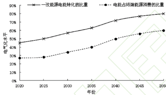 在消(xiao)費(fei)(fei)側,基于能(neng)(neng)(neng)(neng)(neng)(neng)(neng)(neng)(neng)(neng)源(yuan)(yuan)(yuan)(yuan)(yuan)系(xi)統中一次能(neng)(neng)(neng)(neng)(neng)(neng)(neng)(neng)(neng)(neng)源(yuan)(yuan)(yuan)(yuan)(yuan)與終(zhong)(zhong)(zhong)端(duan)(duan)能(neng)(neng)(neng)(neng)(neng)(neng)(neng)(neng)(neng)(neng)源(yuan)(yuan)(yuan)(yuan)(yuan)的(de)平(ping)衡(heng)關系(xi),可以推(tui)算(suan)出(chu)電(dian)(dian)(dian)能(neng)(neng)(neng)(neng)(neng)(neng)(neng)(neng)(neng)(neng)占終(zhong)(zhong)(zhong)端(duan)(duan)能(neng)(neng)(neng)(neng)(neng)(neng)(neng)(neng)(neng)(neng)源(yuan)(yuan)(yuan)(yuan)(yuan)消(xiao)費(fei)(fei)的(de)比重(zhong)。計算(suan)公式為:電(dian)(dian)(dian)能(neng)(neng)(neng)(neng)(neng)(neng)(neng)(neng)(neng)(neng)占終(zhong)(zhong)(zhong)端(duan)(duan)能(neng)(neng)(neng)(neng)(neng)(neng)(neng)(neng)(neng)(neng)源(yuan)(yuan)(yuan)(yuan)(yuan)消(xiao)費(fei)(fei)的(de)比重(zhong)=(一次能(neng)(neng)(neng)(neng)(neng)(neng)(neng)(neng)(neng)(neng)源(yuan)(yuan)(yuan)(yuan)(yuan)電(dian)(dian)(dian)能(neng)(neng)(neng)(neng)(neng)(neng)(neng)(neng)(neng)(neng)轉(zhuan)(zhuan)化(hua)比重(zhong)×電(dian)(dian)(dian)能(neng)(neng)(neng)(neng)(neng)(neng)(neng)(neng)(neng)(neng)轉(zhuan)(zhuan)化(hua)效(xiao)率(lv))/(一次能(neng)(neng)(neng)(neng)(neng)(neng)(neng)(neng)(neng)(neng)源(yuan)(yuan)(yuan)(yuan)(yuan)電(dian)(dian)(dian)能(neng)(neng)(neng)(neng)(neng)(neng)(neng)(neng)(neng)(neng)轉(zhuan)(zhuan)化(hua)比重(zhong)×電(dian)(dian)(dian)能(neng)(neng)(neng)(neng)(neng)(neng)(neng)(neng)(neng)(neng)轉(zhuan)(zhuan)化(hua)效(xiao)率(lv)+一次能(neng)(neng)(neng)(neng)(neng)(neng)(neng)(neng)(neng)(neng)源(yuan)(yuan)(yuan)(yuan)(yuan)非(fei)(fei)電(dian)(dian)(dian)能(neng)(neng)(neng)(neng)(neng)(neng)(neng)(neng)(neng)(neng)轉(zhuan)(zhuan)化(hua)比重(zhong)×加工轉(zhuan)(zhuan)化(hua)效(xiao)率(lv))。通(tong)過能(neng)(neng)(neng)(neng)(neng)(neng)(neng)(neng)(neng)(neng)源(yuan)(yuan)(yuan)(yuan)(yuan)平(ping)衡(heng)表計算(suan)可得過去五年一次能(neng)(neng)(neng)(neng)(neng)(neng)(neng)(neng)(neng)(neng)源(yuan)(yuan)(yuan)(yuan)(yuan)電(dian)(dian)(dian)能(neng)(neng)(neng)(neng)(neng)(neng)(neng)(neng)(neng)(neng)轉(zhuan)(zhuan)化(hua)效(xiao)率(lv)約為38%,非(fei)(fei)電(dian)(dian)(dian)能(neng)(neng)(neng)(neng)(neng)(neng)(neng)(neng)(neng)(neng)轉(zhuan)(zhuan)化(hua)的(de)能(neng)(neng)(neng)(neng)(neng)(neng)(neng)(neng)(neng)(neng)源(yuan)(yuan)(yuan)(yuan)(yuan)加工轉(zhuan)(zhuan)化(hua)效(xiao)率(lv)約為98%。結(jie)合上文推(tui)算(suan)出(chu)的(de)一次能(neng)(neng)(neng)(neng)(neng)(neng)(neng)(neng)(neng)(neng)源(yuan)(yuan)(yuan)(yuan)(yuan)電(dian)(dian)(dian)能(neng)(neng)(neng)(neng)(neng)(neng)(neng)(neng)(neng)(neng)轉(zhuan)(zhuan)化(hua)的(de)比重(zhong),可以推(tui)算(suan)出(chu)電(dian)(dian)(dian)能(neng)(neng)(neng)(neng)(neng)(neng)(neng)(neng)(neng)(neng)占終(zhong)(zhong)(zhong)端(duan)(duan)能(neng)(neng)(neng)(neng)(neng)(neng)(neng)(neng)(neng)(neng)源(yuan)(yuan)(yuan)(yuan)(yuan)消(xiao)費(fei)(fei)的(de)比重(zhong)。如圖2所(suo)示,到(dao)2050年電(dian)(dian)(dian)能(neng)(neng)(neng)(neng)(neng)(neng)(neng)(neng)(neng)(neng)占終(zhong)(zhong)(zhong)端(duan)(duan)能(neng)(neng)(neng)(neng)(neng)(neng)(neng)(neng)(neng)(neng)源(yuan)(yuan)(yuan)(yuan)(yuan)消(xiao)費(fei)(fei)的(de)比重(zhong)可能(neng)(neng)(neng)(neng)(neng)(neng)(neng)(neng)(neng)(neng)提升(sheng)至60%左(zuo)右,電(dian)(dian)(dian)能(neng)(neng)(neng)(neng)(neng)(neng)(neng)(neng)(neng)(neng)將(jiang)逐(zhu)步成為終(zhong)(zhong)(zhong)端(duan)(duan)能(neng)(neng)(neng)(neng)(neng)(neng)(neng)(neng)(neng)(neng)源(yuan)(yuan)(yuan)(yuan)(yuan)主體。