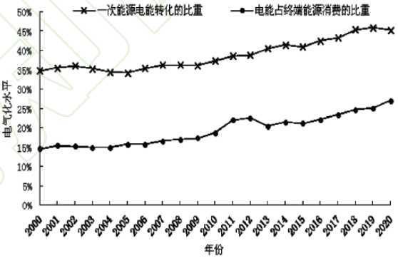 過(guo)(guo)去(qu)二十年(nian)間,隨著經濟社會快(kuai)(kuai)速發展、城市化進程加速和(he)科技水(shui)平不(bu)斷進步,中國的電氣化水(shui)平穩步提(ti)(ti)(ti)升。電氣化水(shui)平在能(neng)(neng)(neng)源(yuan)生(sheng)產側主(zhu)要體現為一(yi)次(ci)能(neng)(neng)(neng)源(yuan)通過(guo)(guo)電能(neng)(neng)(neng)轉(zhuan)化的比(bi)重(zhong),即一(yi)次(ci)能(neng)(neng)(neng)源(yuan)用于發電的比(bi)重(zhong),在消(xiao)費側主(zhu)要體現為電能(neng)(neng)(neng)占終(zhong)端能(neng)(neng)(neng)源(yuan)消(xiao)費的比(bi)重(zhong)。如圖1所示(shi):在生(sheng)產側,一(yi)次(ci)能(neng)(neng)(neng)源(yuan)電能(neng)(neng)(neng)轉(zhuan)化的比(bi)重(zhong)從2000年(nian)的35%左右逐(zhu)步提(ti)(ti)(ti)高(gao)(gao)到(dao)2020年(nian)的45%左右;在消(xiao)費側,電能(neng)(neng)(neng)占終(zhong)端能(neng)(neng)(neng)源(yuan)消(xiao)費的比(bi)重(zhong)從2000年(nian)的不(bu)到(dao)15%逐(zhu)步提(ti)(ti)(ti)高(gao)(gao)到(dao)2020年(nian)的27%左右。近年(nian)來,在能(neng)(neng)(neng)源(yuan)革命戰略引領下(xia),可再生(sheng)能(neng)(neng)(neng)源(yuan)的發展和(he)終(zhong)端電能(neng)(neng)(neng)替代取(qu)得了較快(kuai)(kuai)進展,電氣化水(shui)平提(ti)(ti)(ti)升較快(kuai)(kuai)。