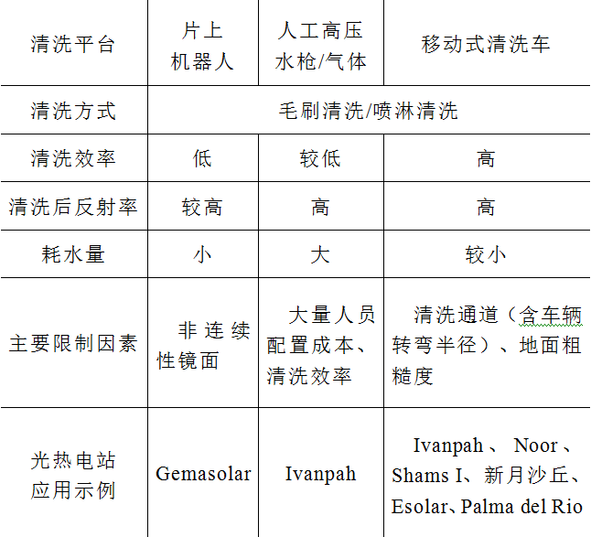 表1典型(xing)光熱(re)電站(zhan)定(ding)日(ri)鏡清洗技術比較