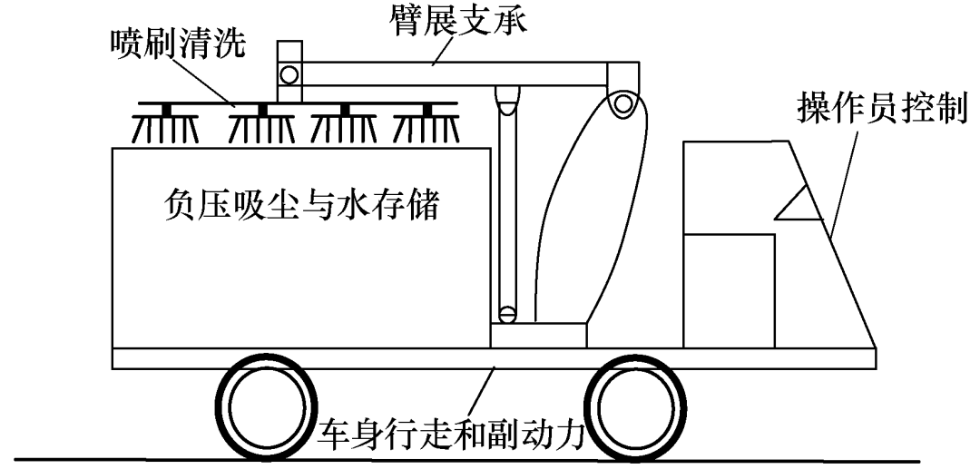 本文設計定日(ri)鏡清(qing)洗(xi)(xi)(xi)裝置為(wei)移(yi)動式清(qing)洗(xi)(xi)(xi)車結構,運用比較(jiao)(jiao)成熟(shu)的(de)(de)載(zai)重(zhong)汽(qi)車系(xi)統(tong)(tong)平臺,搭載(zai)定日(ri)鏡專(zhuan)用清(qing)洗(xi)(xi)(xi)設備和(he)機(ji)械手臂(bei),其(qi)主(zhu)要組成包含車身行走系(xi)統(tong)(tong)、副動力(li)系(xi)統(tong)(tong)、機(ji)械臂(bei)展支(zhi)承機(ji)構、負壓(ya)吸(xi)塵(chen)系(xi)統(tong)(tong)、噴(pen)淋(lin)清(qing)洗(xi)(xi)(xi)系(xi)統(tong)(tong)等,整體系(xi)統(tong)(tong)分別如圖1和(he)圖2所示。清(qing)洗(xi)(xi)(xi)車綜合(he)了國外清(qing)洗(xi)(xi)(xi)車的(de)(de)主(zhu)要優(you)點,采用水噴(pen)淋(lin)清(qing)洗(xi)(xi)(xi)和(he)刷掃(sao)吸(xi)塵(chen)干洗(xi)(xi)(xi)兩種(zhong)清(qing)洗(xi)(xi)(xi)方式相結合(he)的(de)(de)作業模(mo)式,在確保不損(sun)傷鏡面的(de)(de)同時使(shi)清(qing)洗(xi)(xi)(xi)效果得(de)到了較(jiao)(jiao)大的(de)(de)提高。