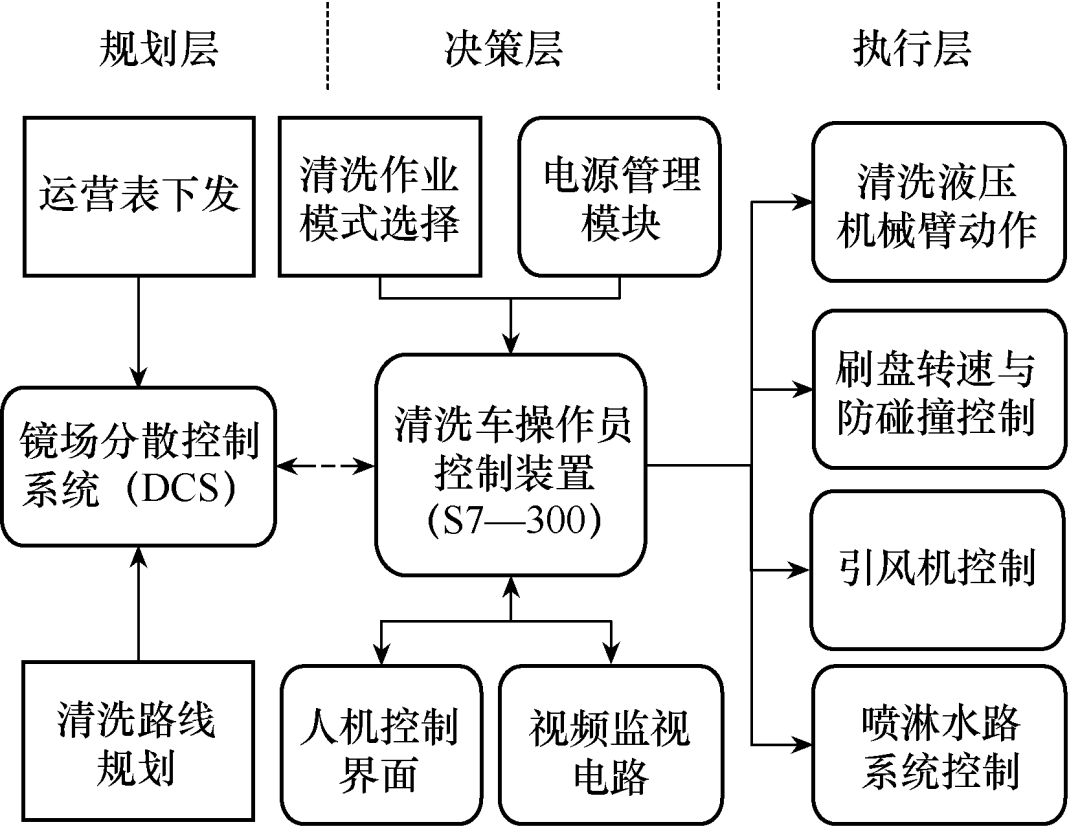 定日鏡清(qing)(qing)洗(xi)控制系統的設計包括鏡場(chang)分(fen)散控制系統(distributed control system,DCS)規劃設計和清(qing)(qing)洗(xi)車(che)操作控制裝置設計兩方面,主(zhu)要硬件(jian)框圖如圖5所示。