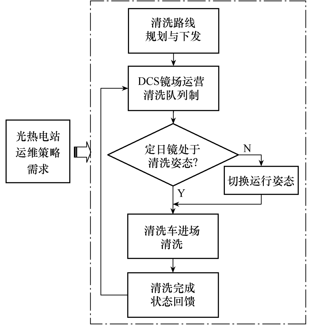 鏡(jing)場(chang)控(kong)制(zhi)系統主(zhu)要(yao)功能為根據電站的(de)定期運(yun)(yun)維需求(qiu),規劃指定單個鏡(jing)場(chang)的(de)定日鏡(jing)清(qing)(qing)(qing)洗路(lu)線(xian),清(qing)(qing)(qing)洗路(lu)線(xian)的(de)選擇需要(yao)充分考慮鏡(jing)場(chang)的(de)不規則布(bu)置(zhi)與鏡(jing)面臟污程度以確定清(qing)(qing)(qing)洗最短運(yun)(yun)行(xing)路(lu)徑,然后編制(zhi)運(yun)(yun)營表和每日清(qing)(qing)(qing)洗隊列,按批次控(kong)制(zhi)定日鏡(jing)旋(xuan)轉(zhuan)于清(qing)(qing)(qing)洗姿態,當清(qing)(qing)(qing)洗車到達后即可(ke)立即開展清(qing)(qing)(qing)洗作(zuo)業,其主(zhu)要(yao)運(yun)(yun)行(xing)控(kong)制(zhi)流程如圖6所示。