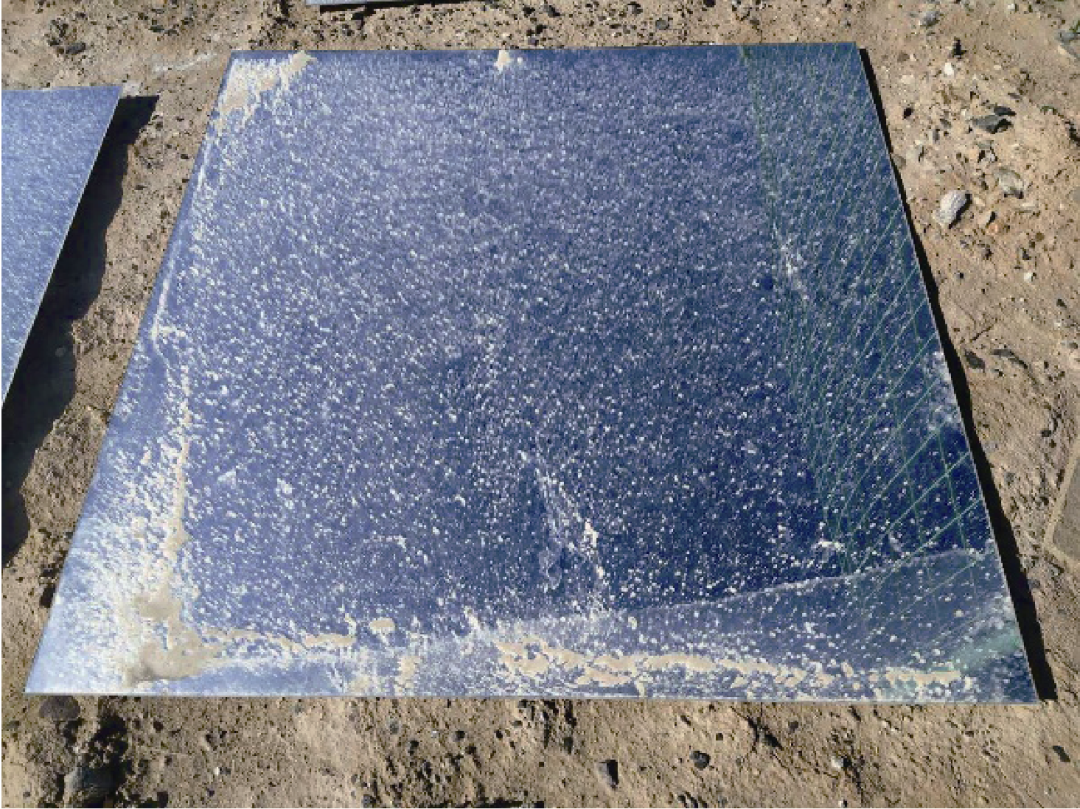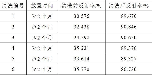 采用光(guang)熱電站(zhan)現(xian)場(chang)長(chang)期放置(zhi)的(de)(de)因臟(zang)污積(ji)灰后(hou)反(fan)射(she)率(lv)較低、不能滿足實際(ji)運行使用的(de)(de)鏡片,如圖7所(suo)示,通過鏡面清掃(sao),然(ran)后(hou)完成鏡面反(fan)射(she)率(lv)測試(shi),對(dui)測試(shi)前(qian)后(hou)的(de)(de)反(fan)射(she)率(lv)結果進行記錄,見表(biao)2。從(cong)結果可(ke)知,清掃(sao)后(hou)的(de)(de)清潔(jie)度(du)整體(ti)達到(dao)86%以上,比未清掃(sao)前(qian)提(ti)高了(le)50%以上,說明清洗車的(de)(de)應(ying)用效果非(fei)常好(hao),清掃(sao)方案具有實踐可(ke)行性。