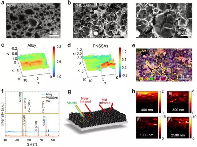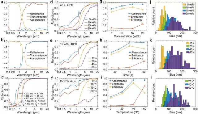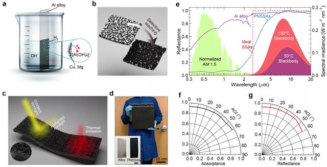其中,圖 2g 和(he)圖 2h,描述了太(tai)陽能吸收器的工作原理(li),具體(ti)來(lai)說(shuo)銅(tong)的納米(mi)結(jie)構(gou)負責對太(tai)陽光(guang)進(jin)行高吸收,而(er)銅(tong)的納米(mi)結(jie)構(gou)也具備對中紅(hong)外波(bo)(bo)段(duan)的高透(tou)性(xing),底(di)部(bu)鋁合金的基底(di)則(ze)對中紅(hong)外波(bo)(bo)段(duan)具有(you)高反射性(xing)。