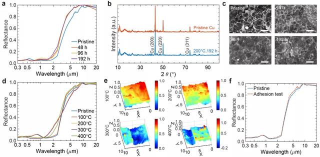 由(you)上(shang)圖可知,高(gao)溫下的(de)光譜穩(wen)定性(xing),是衡(heng)量太陽(yang)能(neng)吸收器(qi)性(xing)能(neng)的(de)重要指標。經過 192 小時和 200°C 的(de)高(gao)溫穩(wen)定性(xing)實驗,銅納米(mi)結構(gou)的(de)光譜穩(wen)定性(xing)、晶(jing)型和表(biao)面(mian)結構(gou)得以保持(chi)。而對瞬時高(gao)溫的(de)不敏感性(xing),也是設計太陽(yang)能(neng)吸收器(qi)的(de)要點之一(yi)。