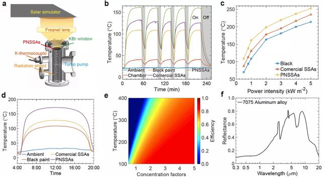 據悉,在(zai)一(yi)個(ge)標準(zhun)太陽光(guang)譜(1kWm-2)的(de)照(zhao)射下,真空腔中改結構(gou)達到 165°C 的(de)穩態溫度。在(zai)不同太陽光(guang)照(zhao)和日光(guang)照(zhao)射下的(de)實(shi)驗(yan)中,也證明了該結構(gou)具有(you)良好的(de)光(guang)熱(re)轉換能力。