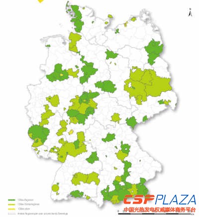 圖:德國(guo)許多地區實現了100%的(de)綠色電力供應(ying)。顏色越(yue)深代表“綠色”程度越(yue)高。