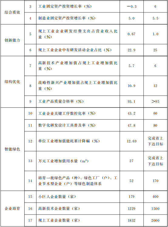 強(qiang)基升(sheng)鏈(lian)取(qu)得新(xin)(xin)進展。打好產(chan)業(ye)(ye)(ye)(ye)基礎高級(ji)化產(chan)業(ye)(ye)(ye)(ye)鏈(lian)現(xian)代化攻(gong)堅戰,到2025年,公(gong)共服務能(neng)力全面配套,關鍵基礎短板有效緩解,新(xin)(xin)型基礎能(neng)力布(bu)局(ju)基本(ben)完成(cheng),培育形成(cheng)400個(ge)(ge)“專(zhuan)(zhuan)精(jing)特新(xin)(xin)”中小企(qi)(qi)業(ye)(ye)(ye)(ye)和(he)認定(ding)100戶(hu)國(guo)家專(zhuan)(zhuan)精(jing)特新(xin)(xin)“小巨人(ren)”企(qi)(qi)業(ye)(ye)(ye)(ye),產(chan)業(ye)(ye)(ye)(ye)基礎能(neng)力顯(xian)著(zhu)增強(qiang)。產(chan)業(ye)(ye)(ye)(ye)鏈(lian)短板明顯(xian)改善,產(chan)業(ye)(ye)(ye)(ye)鏈(lian)韌性和(he)協同性進一(yi)步(bu)增強(qiang),產(chan)業(ye)(ye)(ye)(ye)鏈(lian)效益(yi)大幅提高,打造(zao)6個(ge)(ge)具有重要地(di)位的千億(yi)級(ji)制造(zao)業(ye)(ye)(ye)(ye)優勢(shi)產(chan)業(ye)(ye)(ye)(ye)集群,形成(cheng)5個(ge)(ge)具有競(jing)爭優勢(shi)的百億(yi)級(ji)制造(zao)業(ye)(ye)(ye)(ye)產(chan)業(ye)(ye)(ye)(ye)集聚區。