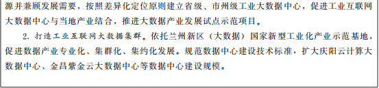 完(wan)善(shan)工(gong)(gong)業(ye)(ye)(ye)互(hu)(hu)聯(lian)網(wang)(wang)大(da)(da)數(shu)(shu)據(ju)(ju)(ju)(ju)公共(gong)服(fu)務體(ti)(ti)系。圍(wei)繞“東(dong)數(shu)(shu)西算”需求,建(jian)設(she)(she)蘭州到(dao)慶陽直聯(lian)網(wang)(wang)絡,引入(ru)和(he)培(pei)育(yu)一批工(gong)(gong)業(ye)(ye)(ye)互(hu)(hu)聯(lian)網(wang)(wang)大(da)(da)數(shu)(shu)據(ju)(ju)(ju)(ju)資(zi)源(yuan)(yuan)提供(gong)(gong)商(shang)(shang)、軟(ruan)硬件產(chan)品服(fu)務商(shang)(shang)和(he)應用提供(gong)(gong)商(shang)(shang),建(jian)立(li)面向全國的工(gong)(gong)業(ye)(ye)(ye)互(hu)(hu)聯(lian)網(wang)(wang)大(da)(da)數(shu)(shu)據(ju)(ju)(ju)(ju)服(fu)務產(chan)業(ye)(ye)(ye)體(ti)(ti)系。建(jian)設(she)(she)工(gong)(gong)業(ye)(ye)(ye)互(hu)(hu)聯(lian)網(wang)(wang)大(da)(da)數(shu)(shu)據(ju)(ju)(ju)(ju)產(chan)業(ye)(ye)(ye)公共(gong)服(fu)務平臺,完(wan)善(shan)數(shu)(shu)據(ju)(ju)(ju)(ju)中心(xin)建(jian)設(she)(she)制度及指南,推(tui)進數(shu)(shu)據(ju)(ju)(ju)(ju)中心(xin)資(zi)源(yuan)(yuan)整合(he)共(gong)享。建(jian)設(she)(she)西部工(gong)(gong)業(ye)(ye)(ye)互(hu)(hu)聯(lian)網(wang)(wang)數(shu)(shu)據(ju)(ju)(ju)(ju)資(zi)產(chan)交易市(shi)場(chang),激發(fa)數(shu)(shu)據(ju)(ju)(ju)(ju)資(zi)源(yuan)(yuan)商(shang)(shang)業(ye)(ye)(ye)價值。鼓勵各(ge)數(shu)(shu)據(ju)(ju)(ju)(ju)中心(xin)、工(gong)(gong)業(ye)(ye)(ye)企業(ye)(ye)(ye)、科(ke)研機構聯(lian)合(he)成立(li)工(gong)(gong)業(ye)(ye)(ye)互(hu)(hu)聯(lian)網(wang)(wang)大(da)(da)數(shu)(shu)據(ju)(ju)(ju)(ju)聯(lian)合(he)實驗(yan)室。積極(ji)參與權威行業(ye)(ye)(ye)組織的等級評估,擴(kuo)大(da)(da)影(ying)響力。支(zhi)持金昌、酒(jiu)泉(quan)創建(jian)國家(jia)新型工(gong)(gong)業(ye)(ye)(ye)化產(chan)業(ye)(ye)(ye)示范基地(大(da)(da)數(shu)(shu)據(ju)(ju)(ju)(ju))。到(dao)2025年,培(pei)育(yu)2—3家(jia)大(da)(da)數(shu)(shu)據(ju)(ju)(ju)(ju)產(chan)業(ye)(ye)(ye)領軍企業(ye)(ye)(ye)。