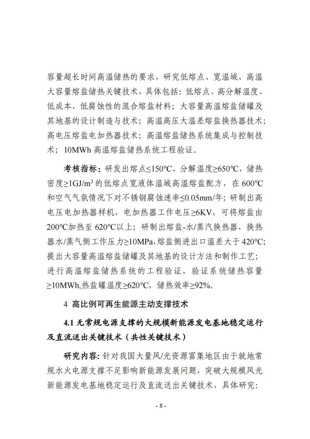 其中涉及儲(chu)(chu)能(neng)細分任務九項,低(di)成本(ben)長壽命錳基儲(chu)(chu)能(neng)鋰離子(zi)(zi)電(dian)池(chi)(chi)(chi)、有(you)機儲(chu)(chu)能(neng)電(dian)池(chi)(chi)(chi)、水(shui)系金屬離子(zi)(zi)儲(chu)(chu)能(neng)電(dian)池(chi)(chi)(chi)、百兆瓦時級(ji)鈉離子(zi)(zi)電(dian)池(chi)(chi)(chi)儲(chu)(chu)能(neng)技術(shu)(shu)、高功率鋰離子(zi)(zi)電(dian)池(chi)(chi)(chi)儲(chu)(chu)能(neng)技術(shu)(shu)、高功率雙(shuang)離子(zi)(zi)儲(chu)(chu)能(neng)電(dian)池(chi)(chi)(chi)、100MW級(ji)先進壓縮空(kong)氣(qi)儲(chu)(chu)能(neng)技術(shu)(shu)、新一代液(ye)流電(dian)池(chi)(chi)(chi)儲(chu)(chu)能(neng)技術(shu)(shu)、寬液(ye)體(ti)溫域高溫熔(rong)鹽儲(chu)(chu)熱技術(shu)(shu)。其中關于(yu)熔(rong)鹽儲(chu)(chu)熱技術(shu)(shu)的描述如下: